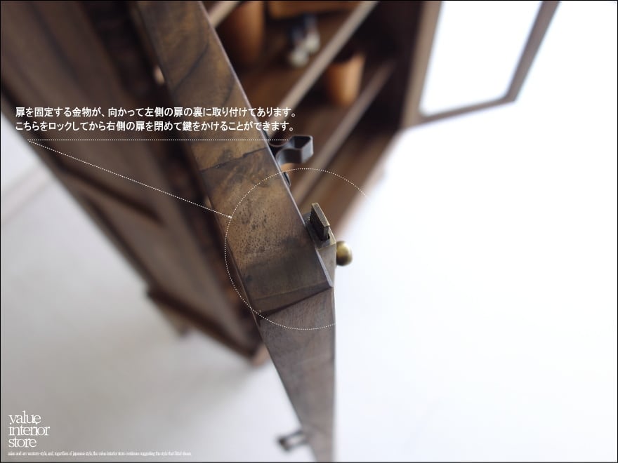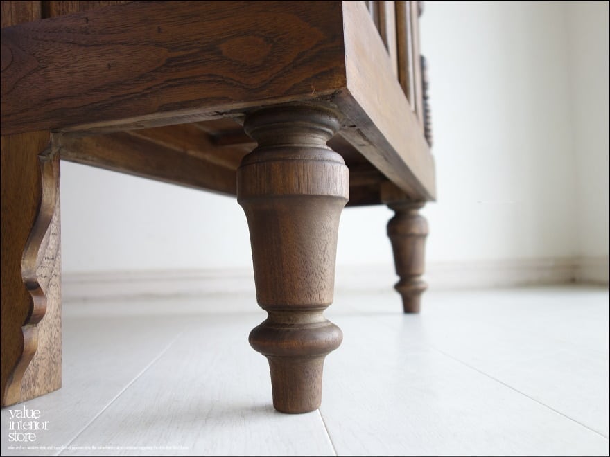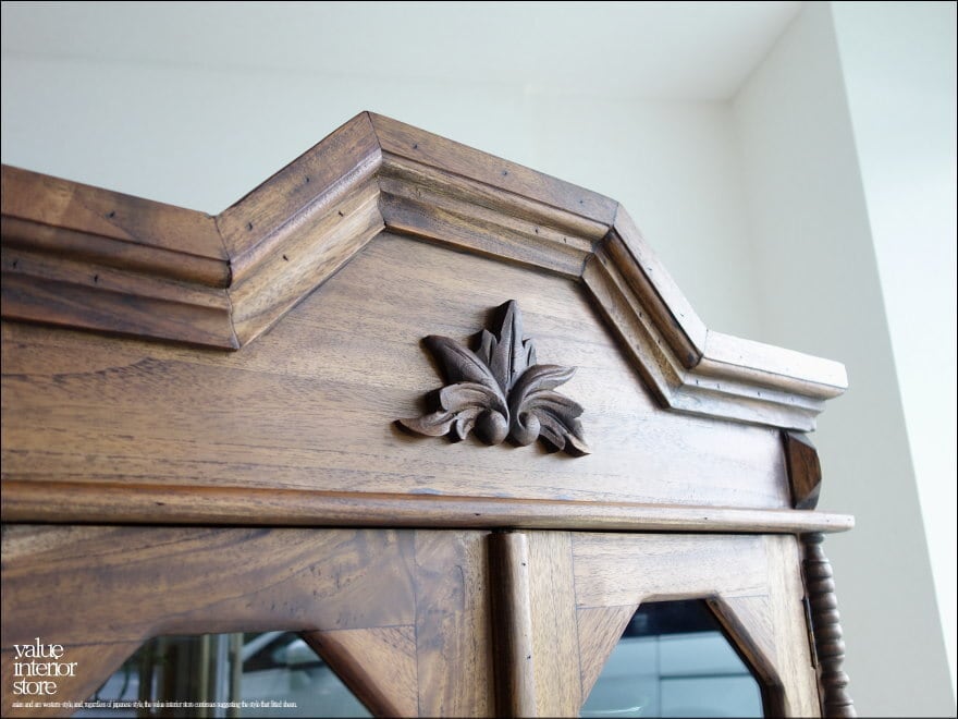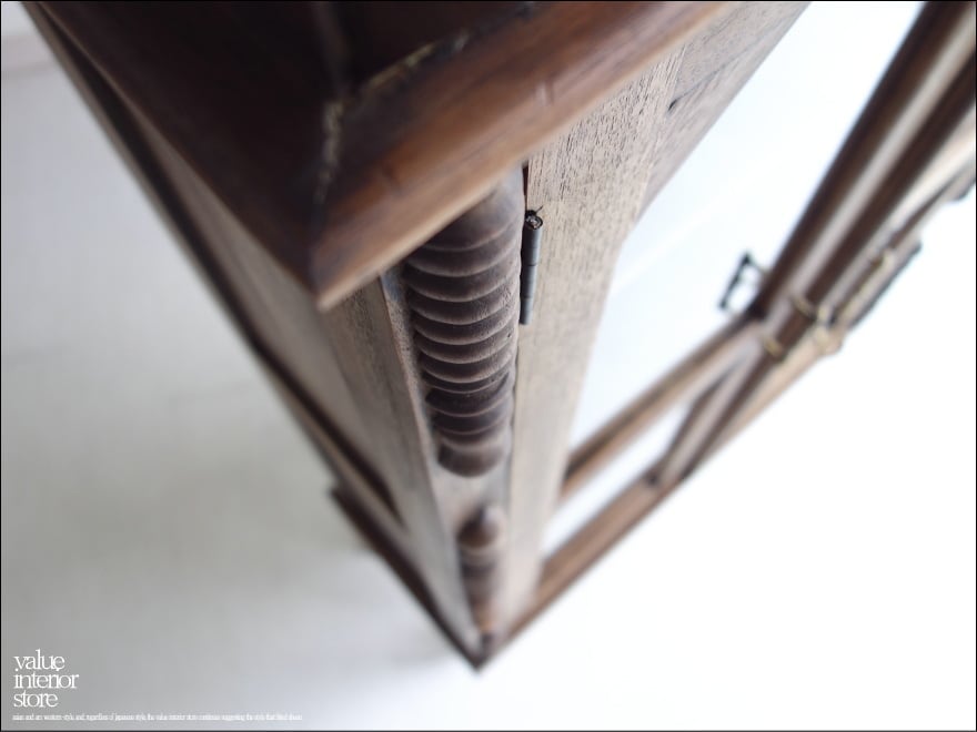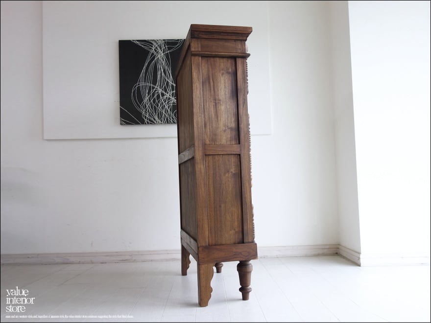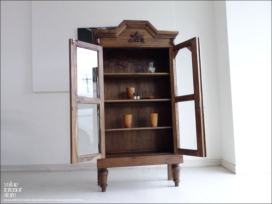 ほどよい大きさでキッチンの食器棚として、リビングの収納棚としても便利にお使いいただける鍵付きキャビネット。上部の彫り物が、この家具のシンボルマークとなっていて印象的です。クリアガラスで中身が見えるのでディスプレイするような感覚で中に入れるものにもこだわりたくなりますね。食器はもちろん、本棚、収納棚、カフェやショップなどの什器としてもおすすめです。また、チークは油分を多く含みますので、お使いいただくうちにさらに色味に深みが増すところも楽しみの一つです。