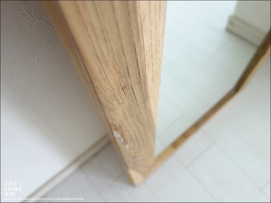 全身を映せる大きめサイズの姿見です。プリミティブな仕上がり、深みのある色合いが魅力で空間を暖か味のある雰囲気に演出してくれます。フレーム裏面縦方向に2箇所壁掛け用の穴がありますので壁にビスを設置して頂き引っ掛けるか、安全な場所に立掛けてご使用下さい。