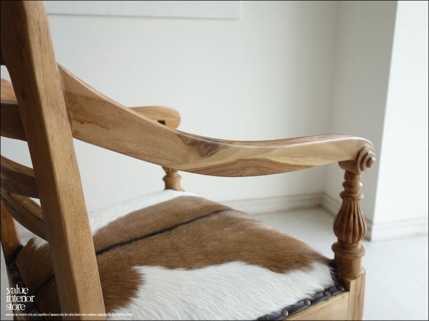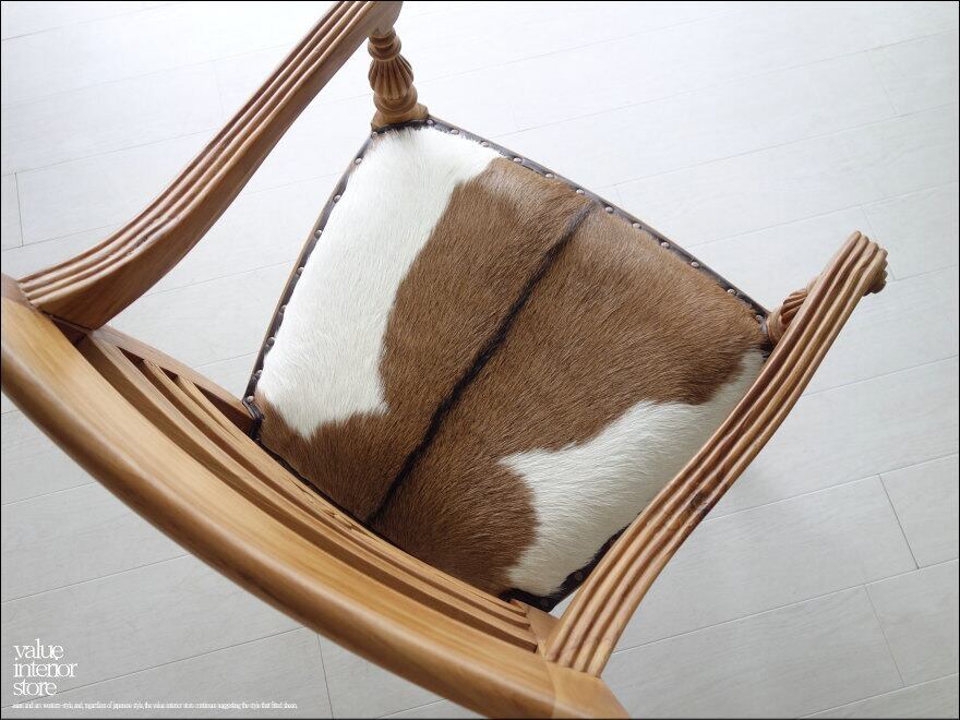 チークの味のある風合いが魅力のウッドフレームに、高級感のある毛皮付きレザーを座面を独特なスタッズで打ち、置いてあるだけでも存在感のあるチェア。