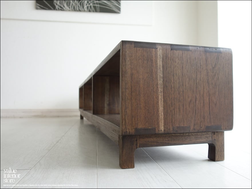 総無垢材でシンプルなデザインが魅力のテレビボード。余分を作らないシンプルな設計ですので、自由な配置が可能で、収納スペースも無駄なく利用できます。表面はティーブラウンでやや濃い目に仕上げていますので、ペースダウンした雰囲気をお楽しみいただけ上品で高級感があります。(バリューインテリアストアオリジナル)