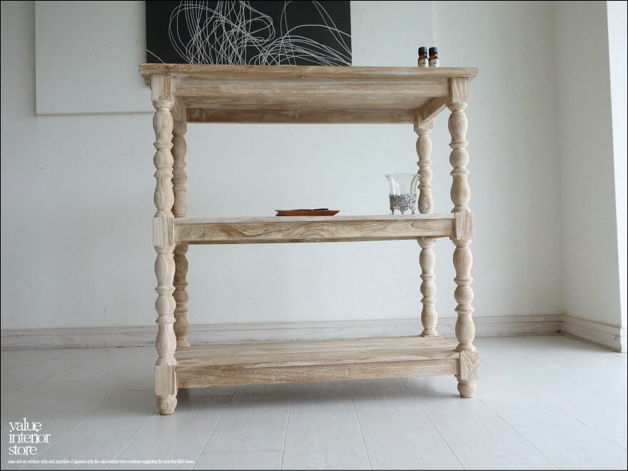 表面は凹みに白色を薄く残したナチュラルホワイト仕上げ。表面仕上げに一工夫することで、一層素朴で明るい雰囲気に仕上がりました。余分な装飾を無くしたシンプルな棚板と、丸く柔らかな印象の脚とのバランスがとってもかわいいですよ。きっとお部屋を素敵な雰囲気に包んでくれます。