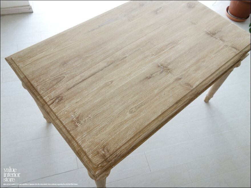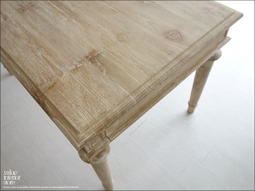 凹みに薄っすらと入った白色とチーク材の木目とのコントラストが印象的なダイニングテーブル。