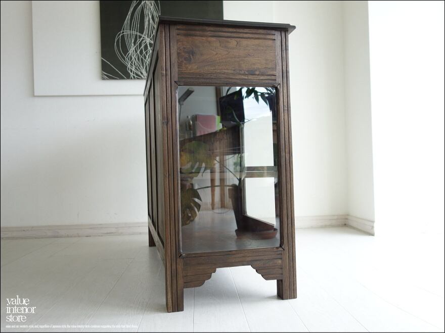 ・渋く落ち着いた色合いに仕上げられたガラスキャビネット。