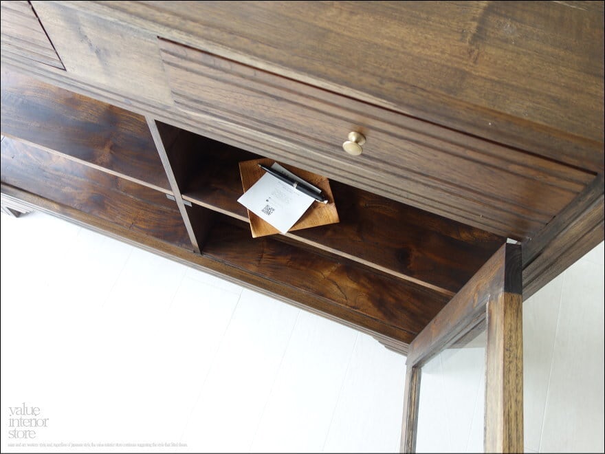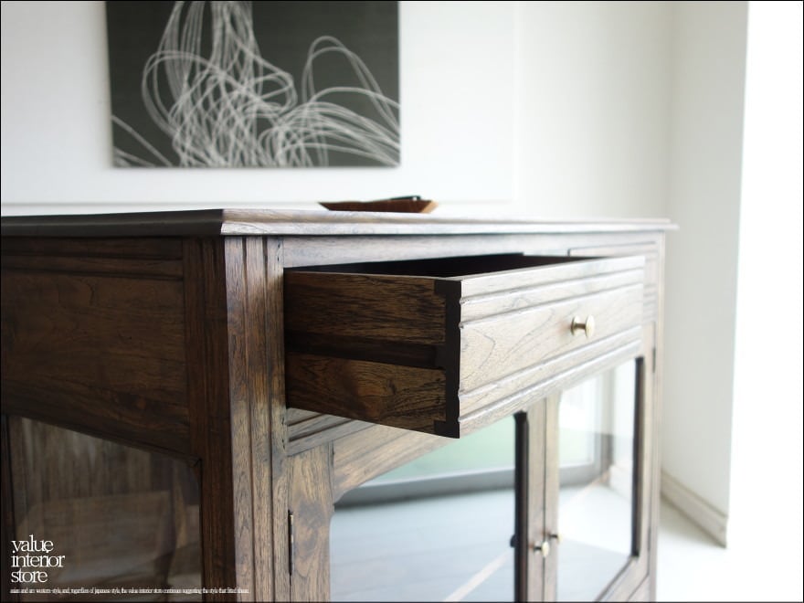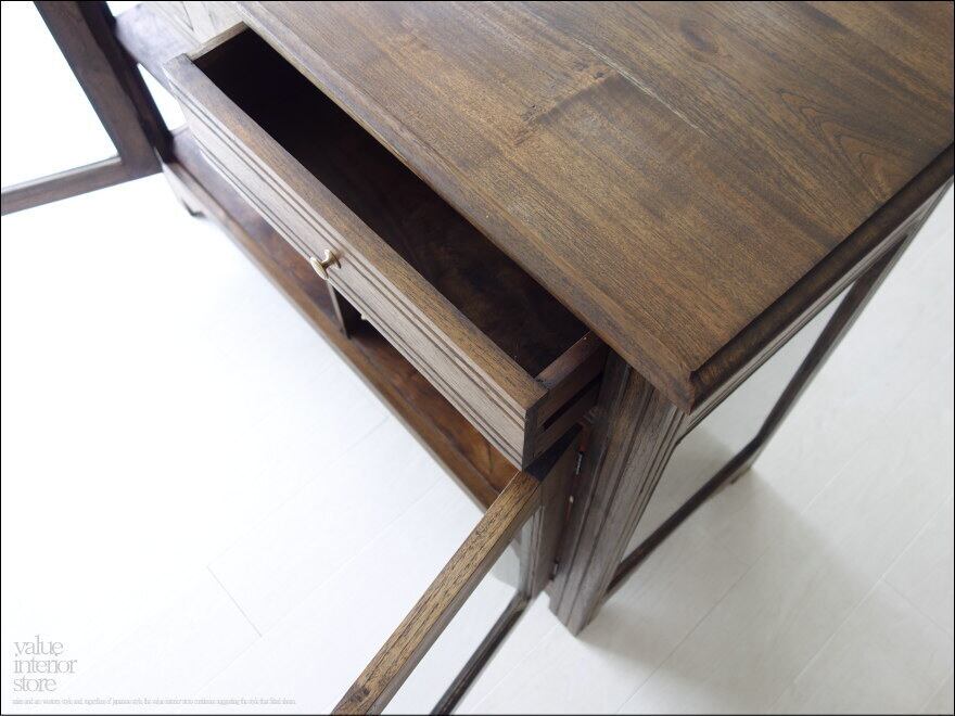 食器棚やリビングの飾り棚として幅広くお使いいただけます。引出しも2箇所あるので物によって上手に収納できます。真鍮金具はシンプルなものを合わせましたので見た目もスマートな印象。