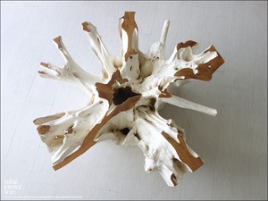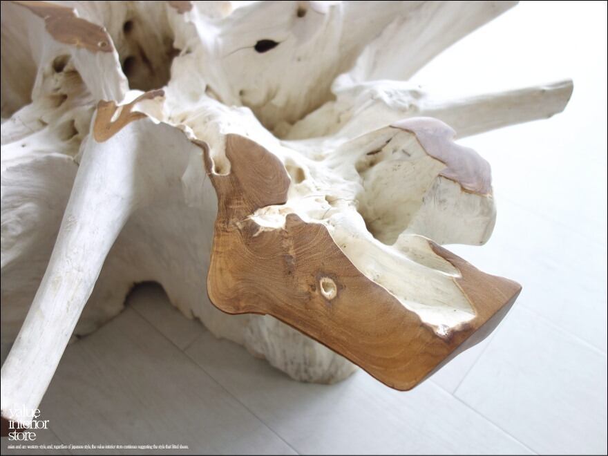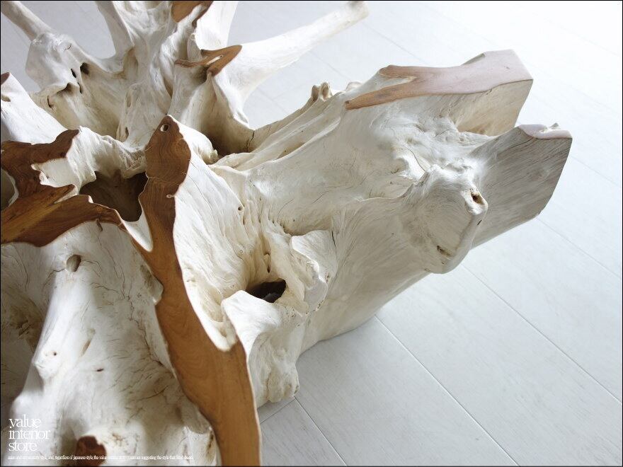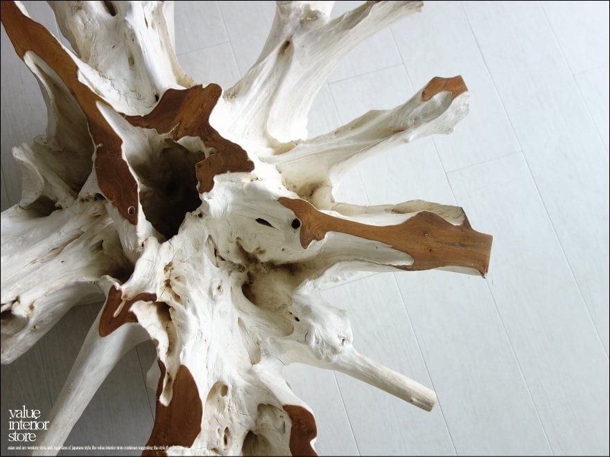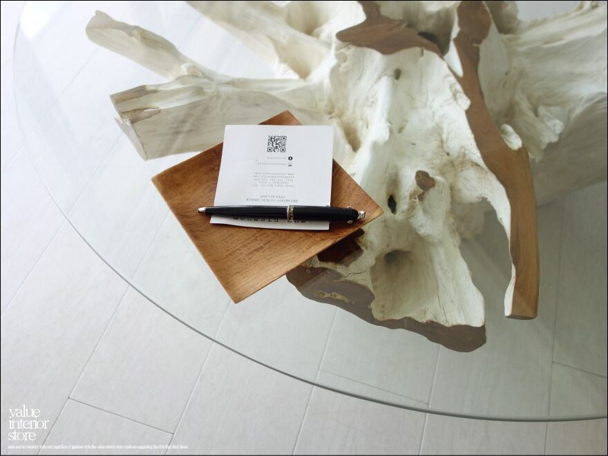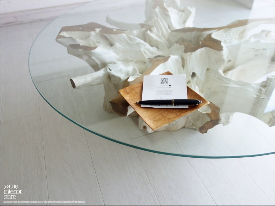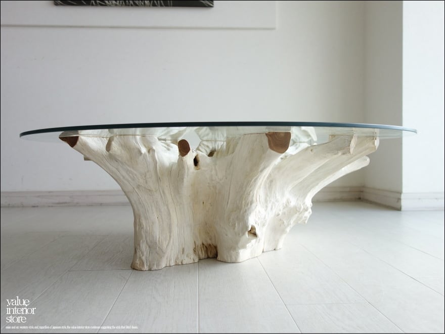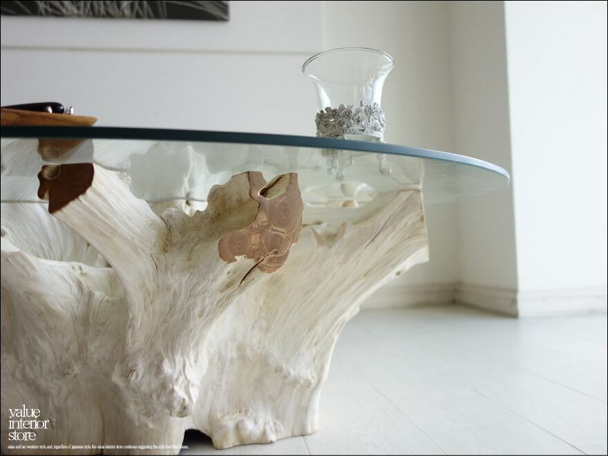 チークの根本をテーブルに使った何ともプリミティブなガラステーブル。