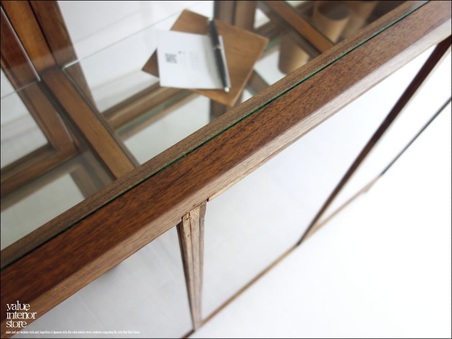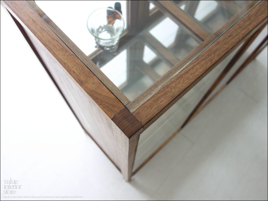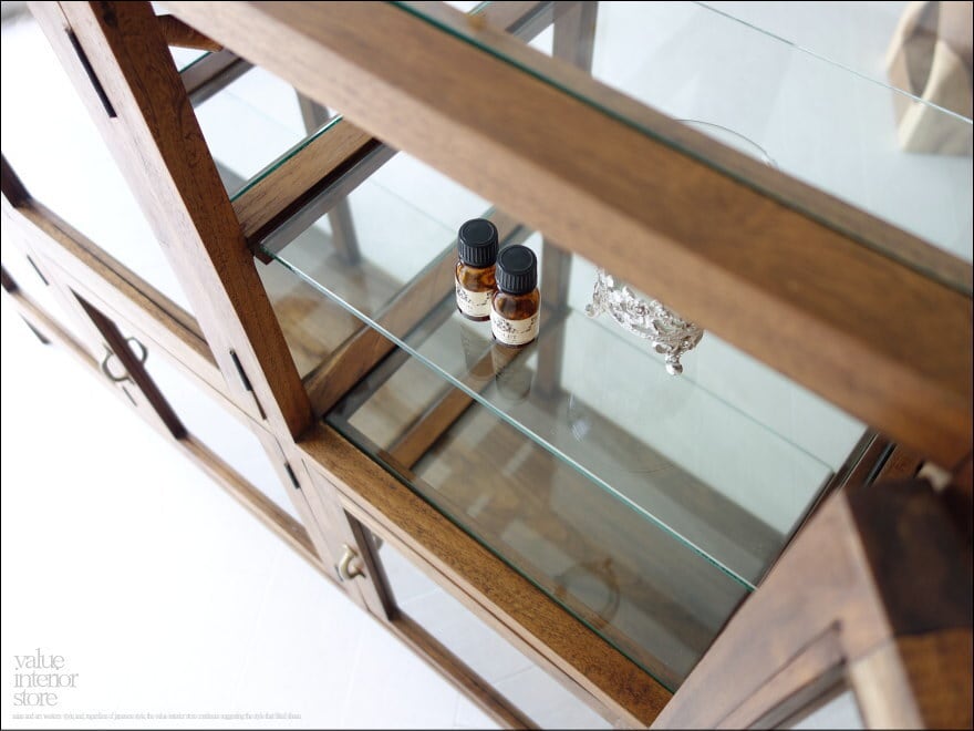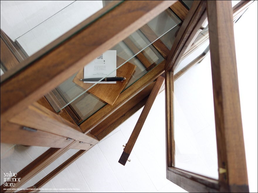 フレームはチーク総無垢材で金具は真鍮製を使用いたしました。ガラス面が多くどの角度からも中がキレイに見えますので、お店のショーケースとしてもお使いいただけます。