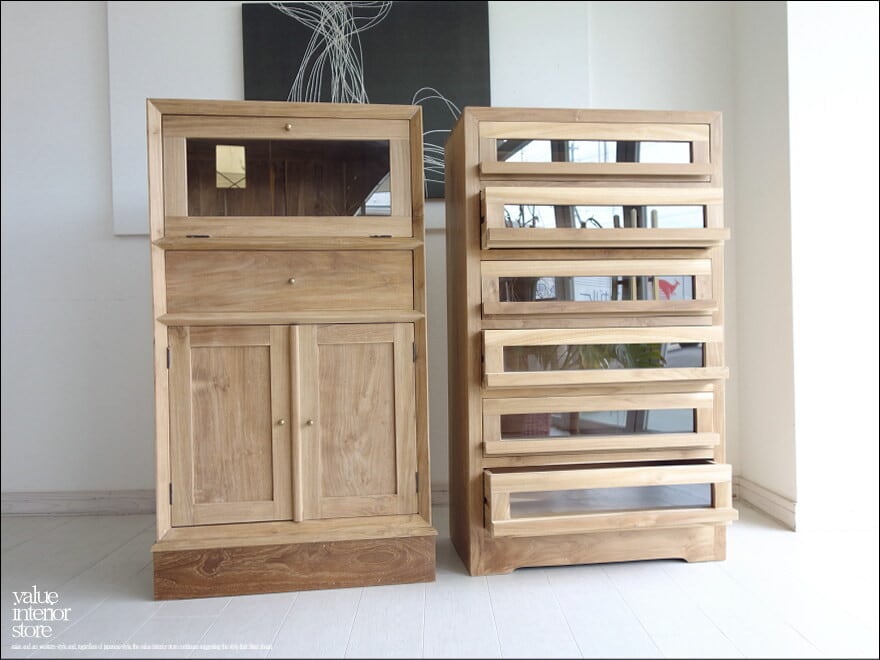 チークの上品な木目を活かした収納キャビネットとチェスト。
