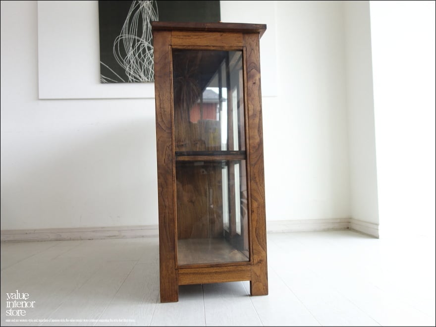 正面・側面がガラス仕様のため光が入りやすく中に収納するものもディスプレイするような感覚で美しく飾りたくなります。真鍮の取っ手もレトロな印象でいいですね。アンティークではありませんが古くからそこにあったような温か味のある仕上がりになっています。