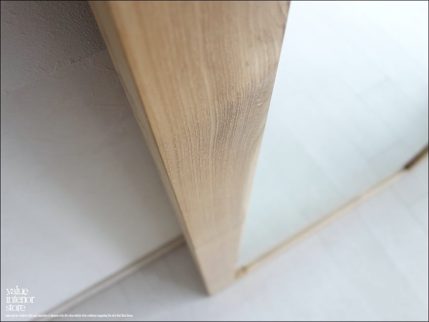 無塗装ですので、いわゆるチーク色に変化していくのが楽しみな、全身を映せるサイズの姿見です。シンプルでどんなテイストにも馴染みやすいデザインですので、空間を暖か味のある雰囲気に演出します。フレーム裏面縦方向に2箇所壁掛け用の穴がありますので壁にビスを設置して頂き引っ掛けるか、安全な場所に立掛けてご使用下さい。