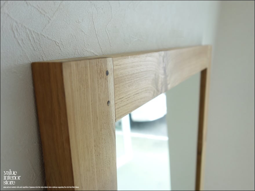 チークの木目が存分に生かされたナチュラルでアンフィニッシングフレームのミラー。