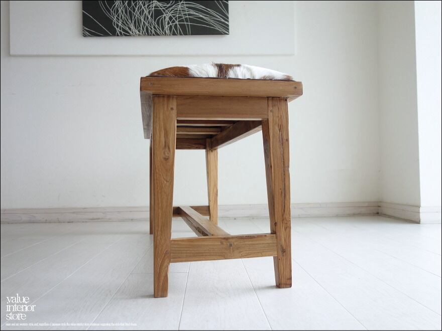 オールドチークの味のある風合いが魅力のウッドフレームに、高級感のある毛皮付きレザーを独特なスタッズで打ち、置いてあるだけでも存在感のあるベンチ。落ち着いた雰囲気でアンティークな家具やアジアン家具とよくマッチします。チークの持つ張りと硬く美しい木目の特徴を引き出していて、素材の良さを感じさせてくれます。お気に入りスペースにぜひお使い下さい。