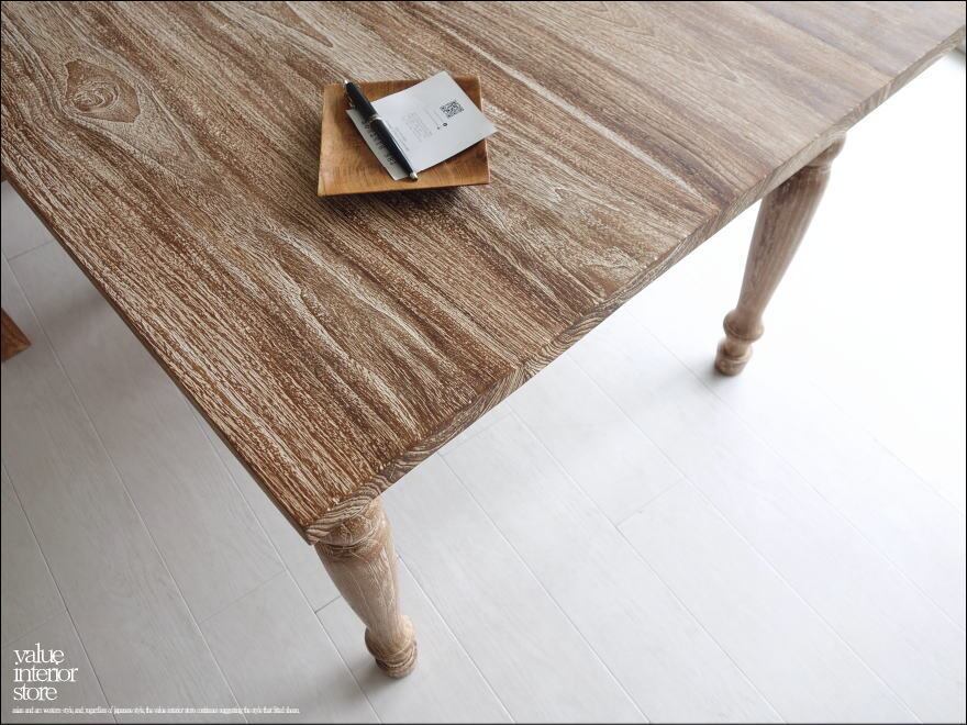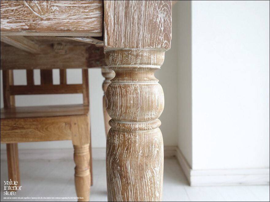 天板を支えるフレーム部分にもしっかりと厚みがあり重厚感があり、落ち着いた大人の雰囲気があります。チークの渋く硬い特徴を引き出す角型の天板を柔らかな丸脚が支えていて、そのバランスが上品です。表面はワイヤーブラシで軽く削ってから白色を塗布した後、さらにサイディングして凹みに白色を残したナチュラルホワイト仕上げ。こんなテーブルで毎日食事ができたらペースダウンできステキでしょうね。ショップやカフェのテーブルとしてもおすすめです。