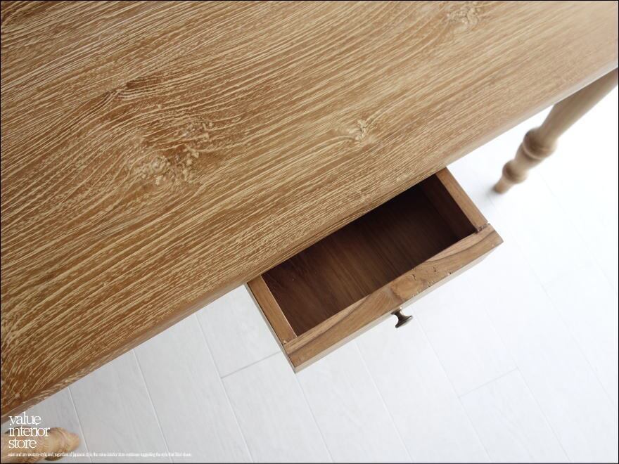 表面はワイヤーブラシで軽く削り取ってからサイディングした仕上げで、チーク材の張りと硬い質感が伝わってきます。職人さんが丹精こめて作った印象に溢れていて、このデスクに向かうと自然と気持ちまで落ち着くようです。西洋、アジアン、和風モダン、北欧など幅広いテイストのインテリアと相性良くコーディネートできますのでお気に入りスペースでお使いください。
