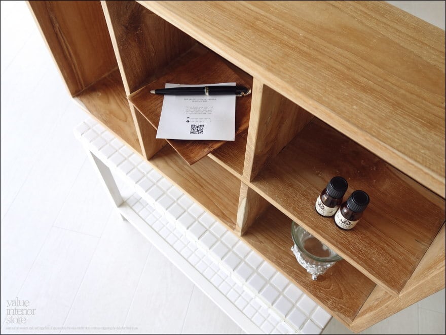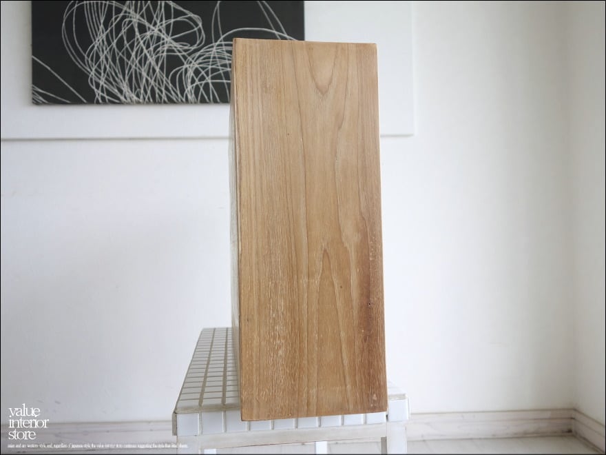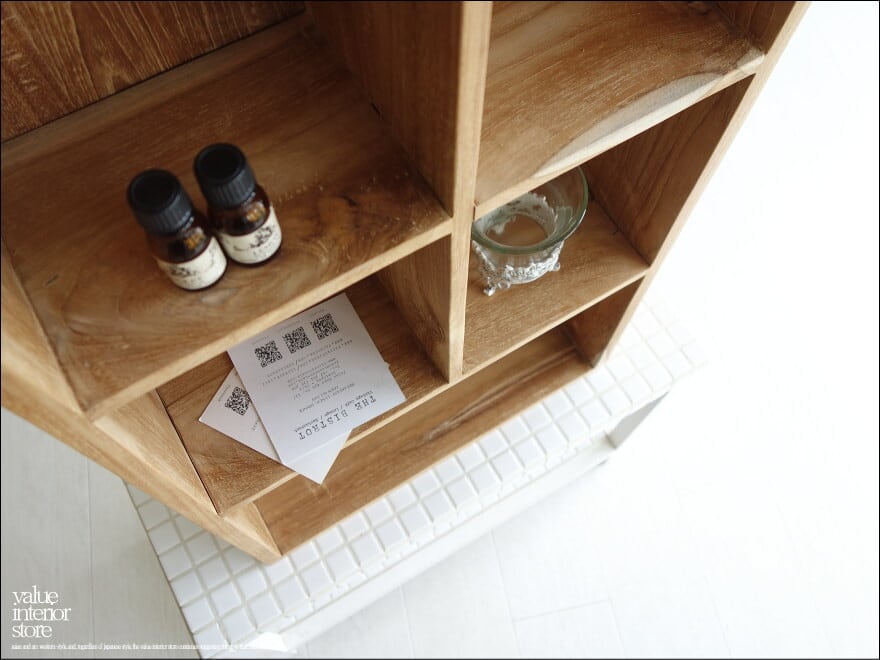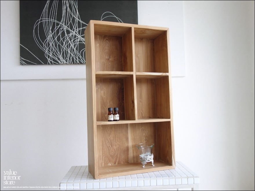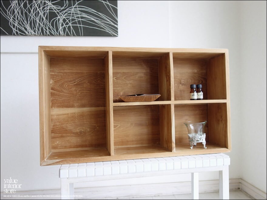 大きさのあるウォールシェルフで、横置き、縦置きとご使用方法に応じてお使いいただけ、仕切りも小分けに整理して収納いただけます。硬さと張りのあるチーク材独特のビシッとした質感が伝わってきます。