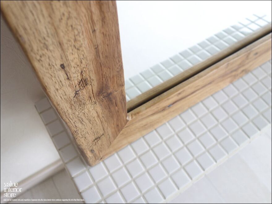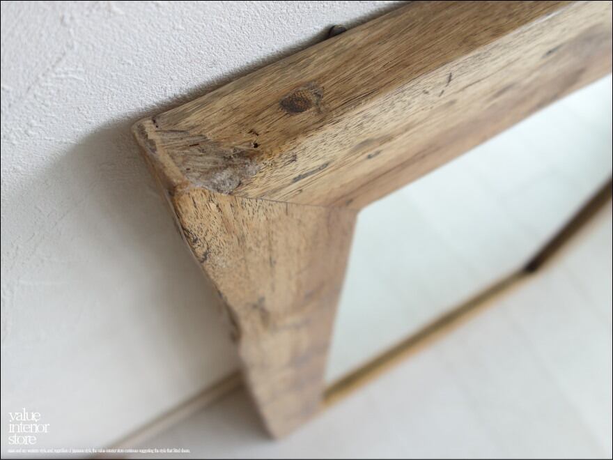 オールドチークならではの味わい深い木目が存分に生かされた厚めのフレームが印象的なミラー。