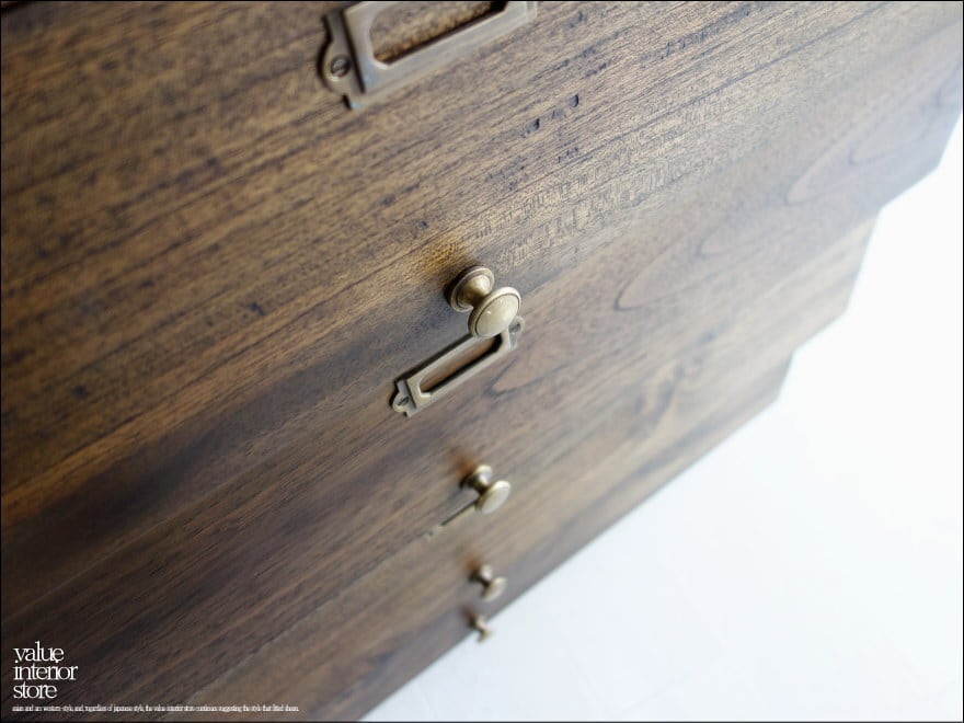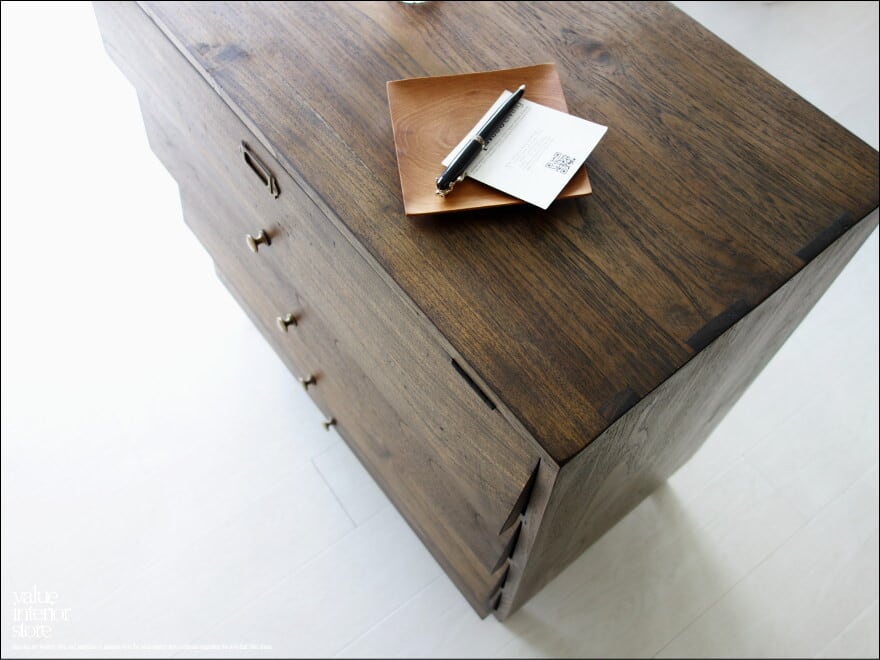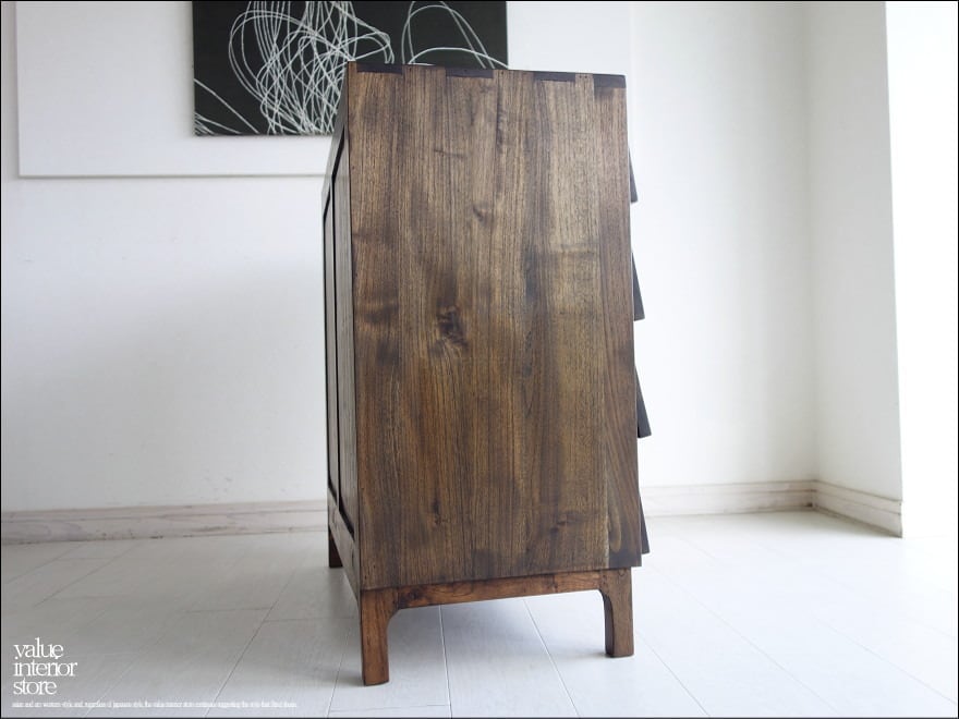 チークの持つ張りと硬く美しい木目の特徴を引き出していて、質の良さを十分に感じさせてくれます。4段の扉は留め金具がない仕様となっており開閉しやすく、横から見る扉の下が少し浮くようなデザインです。