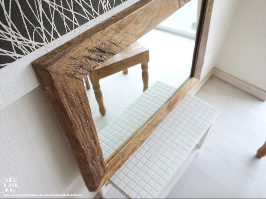 オールドチークならではの味わい深い木目が存分に生かされた厚めのフレームが印象的なミラー。