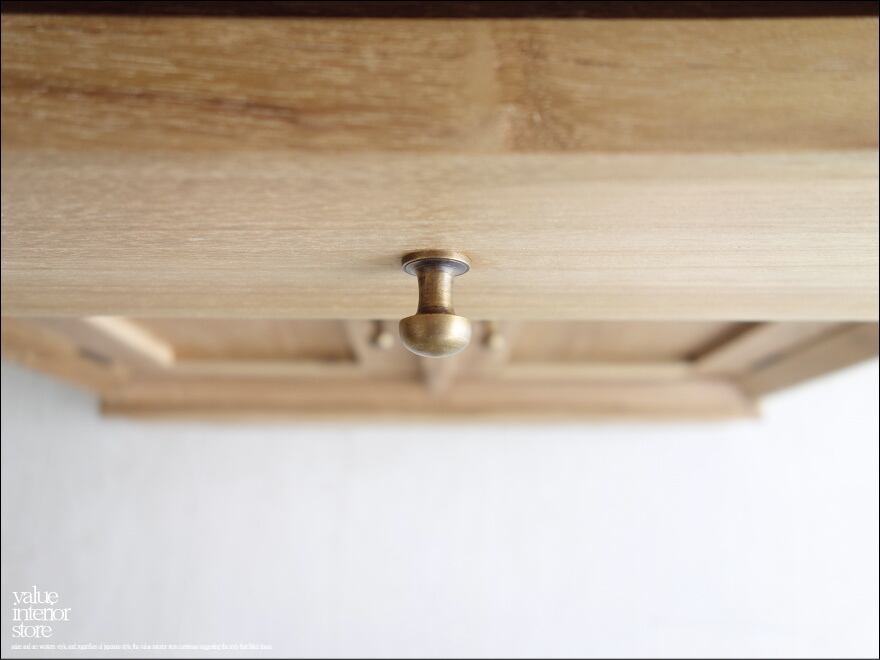 ツマミや扉の丁番、また丁番を留める木ネジも全てに真鍮製のものを使用しました。表面はアンフィニッシングですので、変わり行く色の変化(いわゆるチークカラーへの変化)をお楽しみいただけます。1点1点手作りで、無垢材の質の良さを十分に感じさせてくれます。お気に入りスペースでお使い下さい。