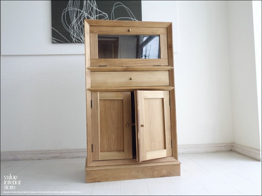 一番上のガラス扉は手前に引いて開きます。中断には引出し、下は観音扉のキャビネットとそれぞれ異なった用途にお使いいただけますので、リビングやキッチンでは保管庫などとしても収納力を発揮します。