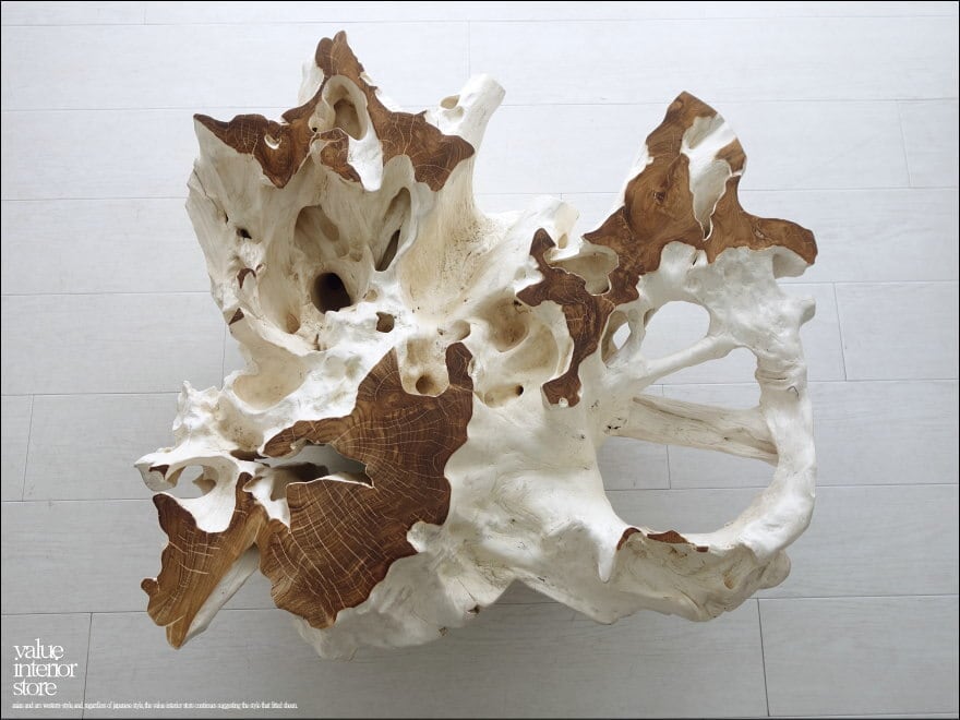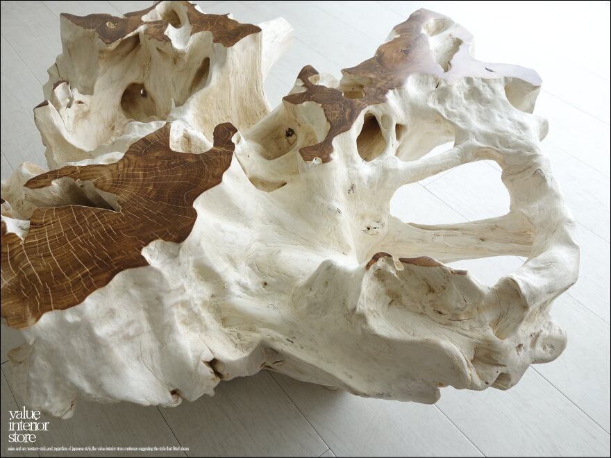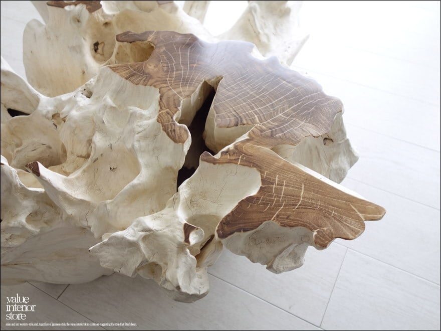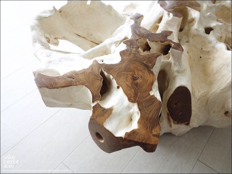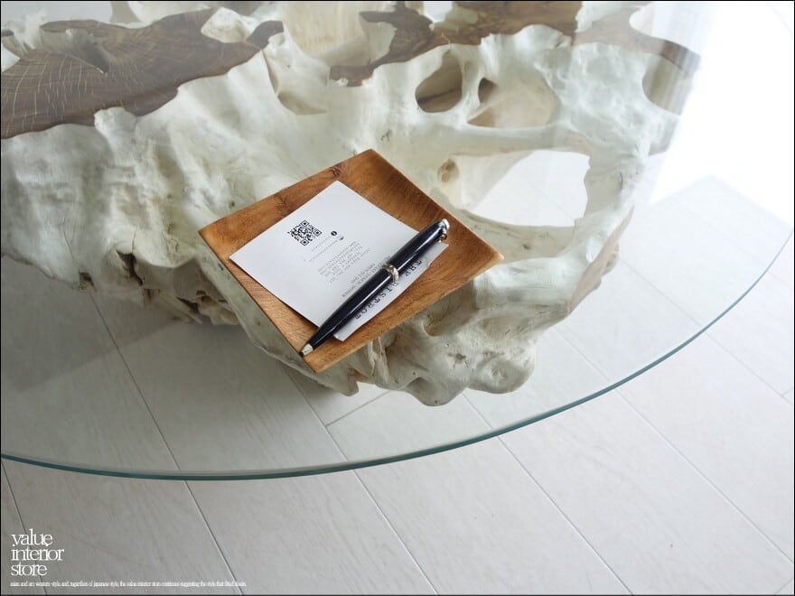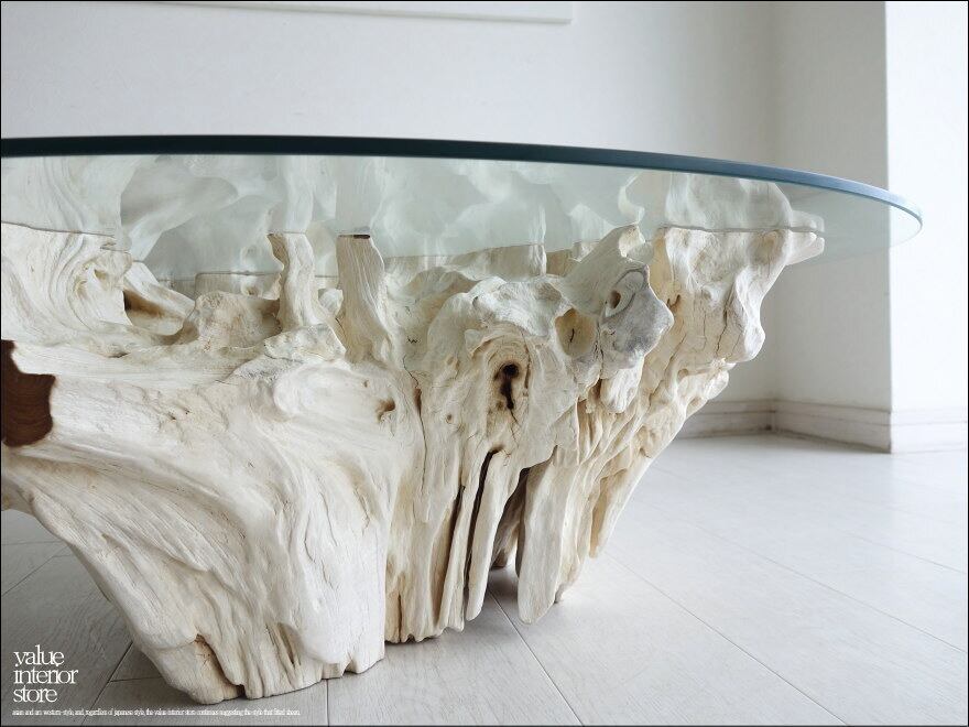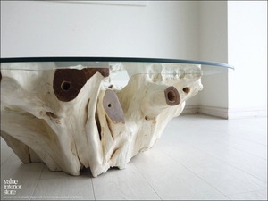 チークの根本をテーブルに使った何ともプリミティブなガラステーブル。