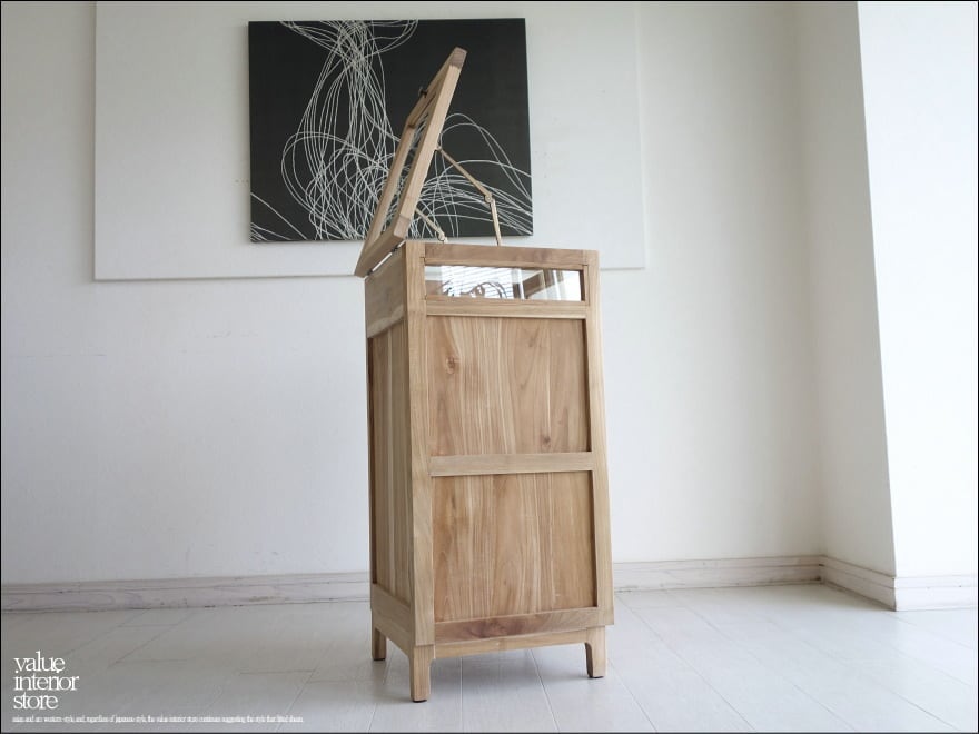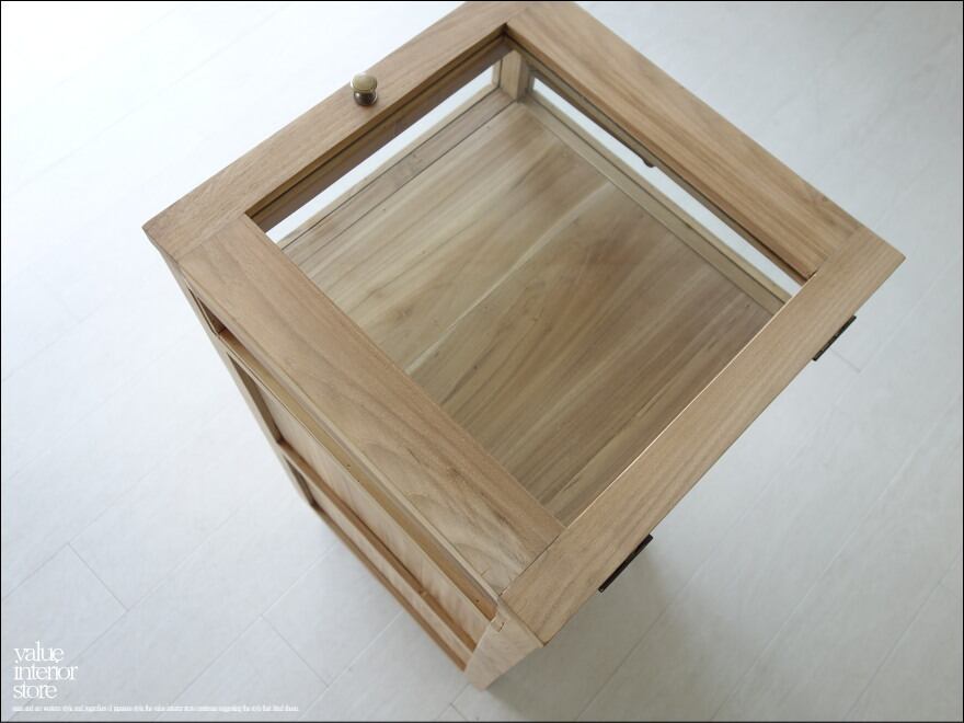 ナチュラルで木目の際立つ無垢材の質感と、真鍮金物が良く似合っています。ガラス部分には時計やアクセサリーを、チェストには小物を収納したりと使い分けができ便利です。ショップのディスプレイ用のショーケースとしてもチェストに在庫を収納でますので什器としてもお勧めです。ガラスケースのフタは真鍮アームが付いていますので、手で支えなくても開けっ放しにしておけるタイプです。ガラスケースと一体化していることでとてもおしゃれな印象のチェスト。