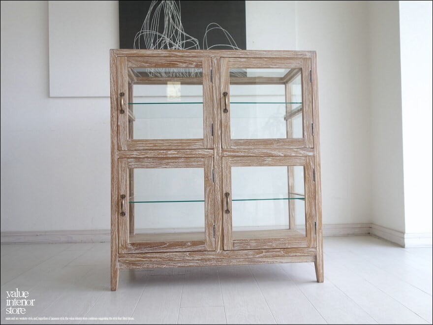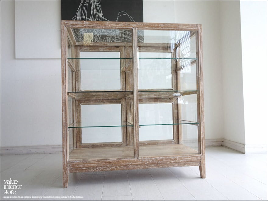 中がキレイに見えますので、お店のショーケースとしてもお使いいただけます。中は仕切りの無い空間ですので用途に合わせて自由に使えます。アンティークではありませんが古くからそこにあったような温か味のある仕上がりになっています。カフェなどのパン用ショーケース、食器棚、小物のディスプレイなど幅広くお使いください。