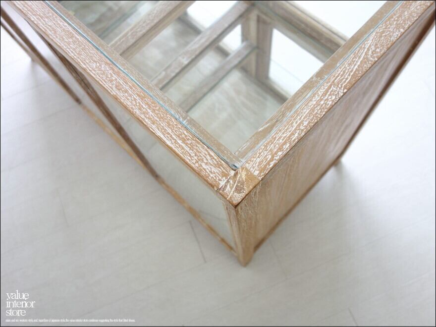 チーク材の木目を起こし、白色を塗布してからペーパーで表面を仕上げるホワイトウォッシュ仕上げ。
