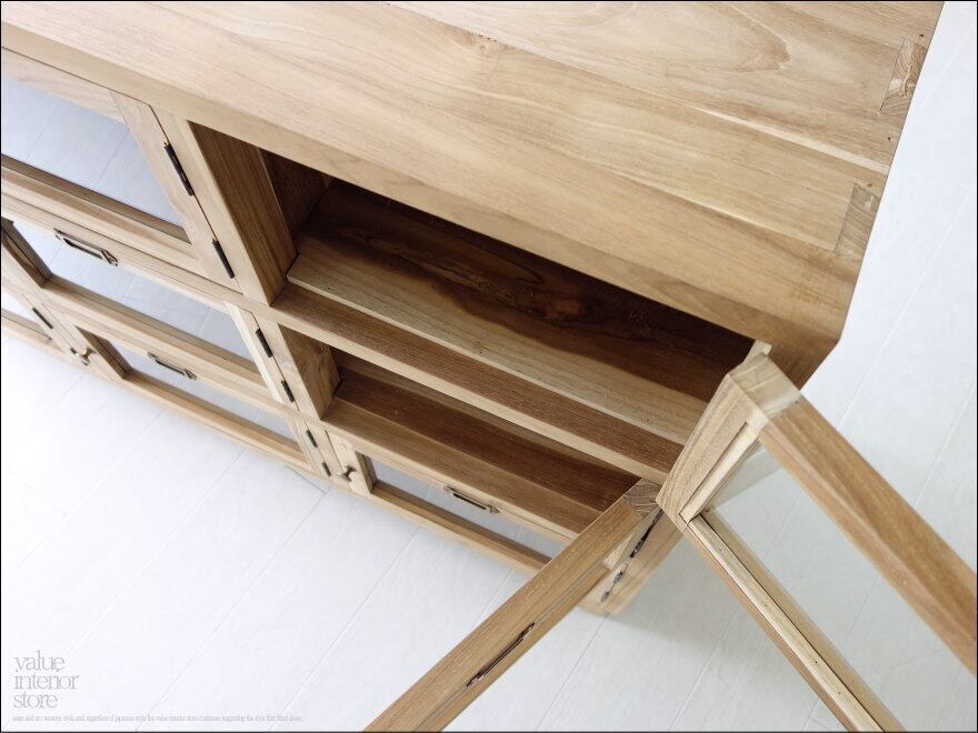 ナチュラルでチークの持つ木目の美しさが際立った無塗装の前面ガラスロッカー。