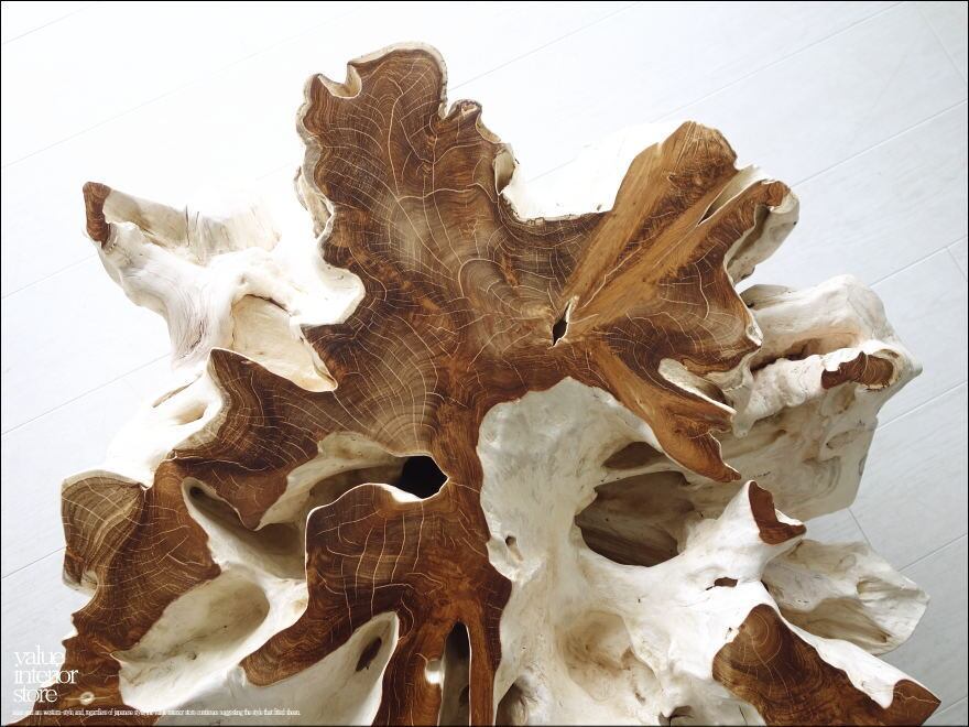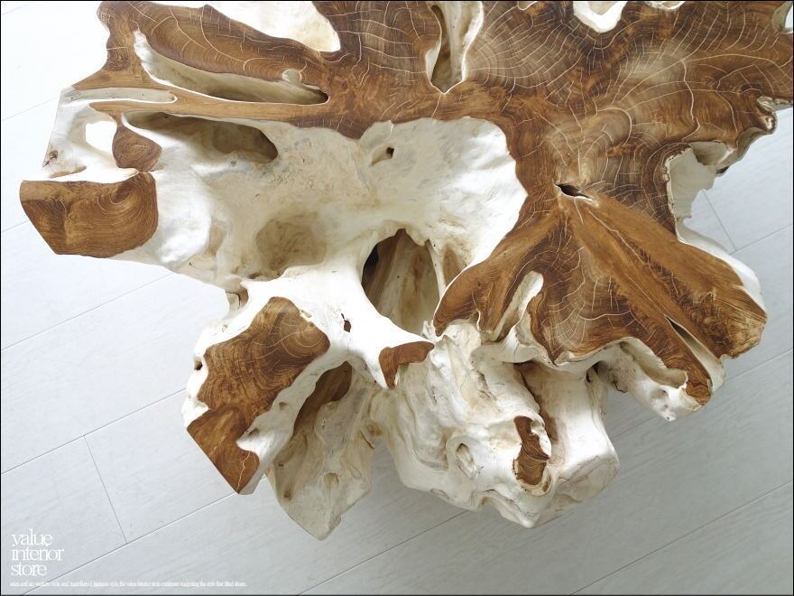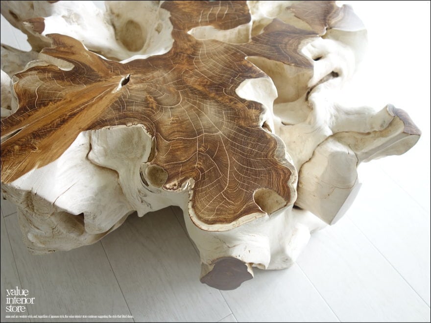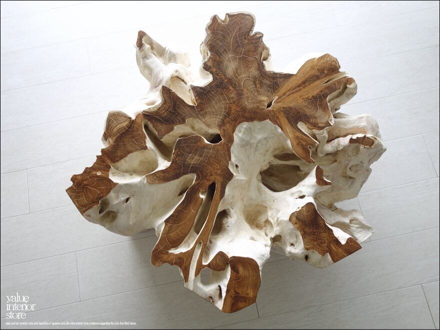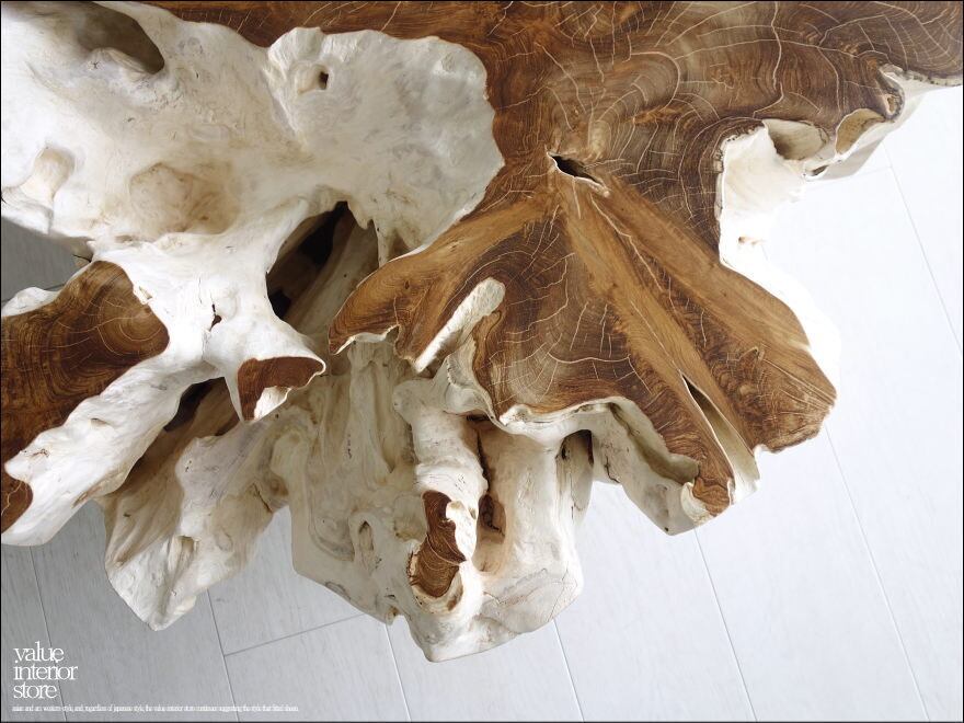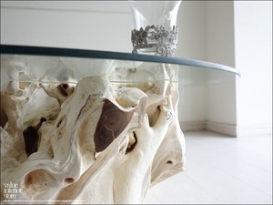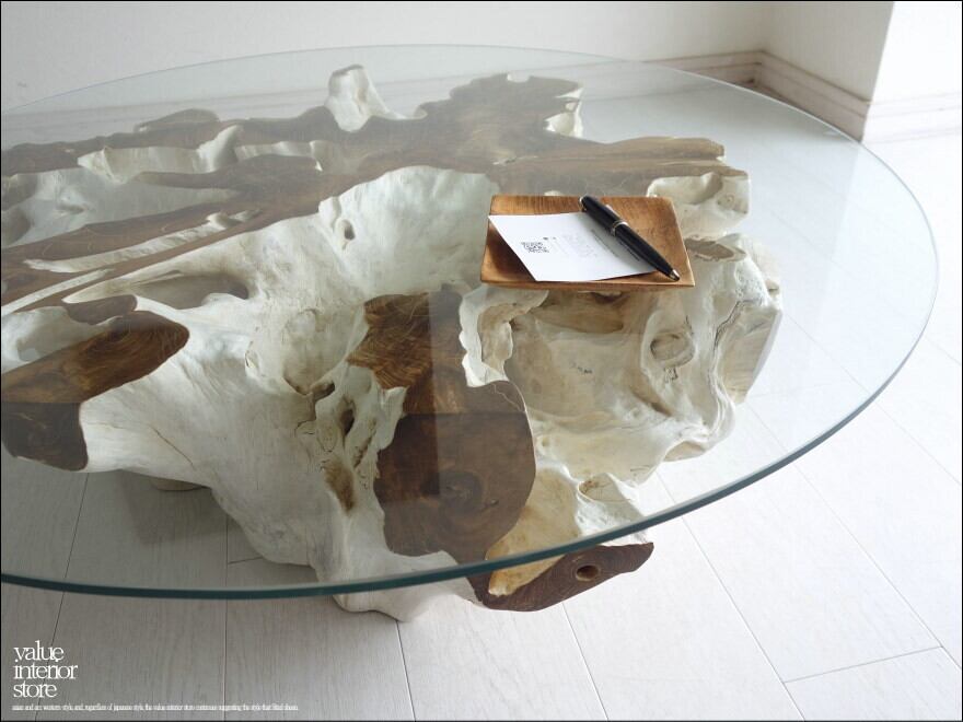 チークの根本をテーブルに使った何ともプリミティブなガラステーブル。