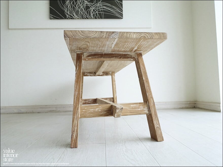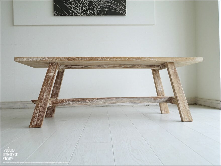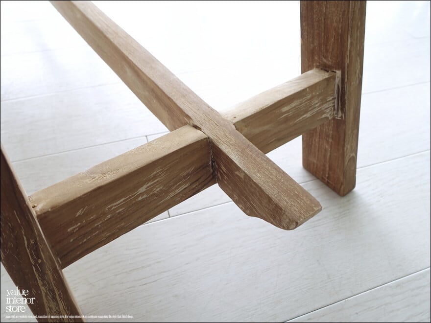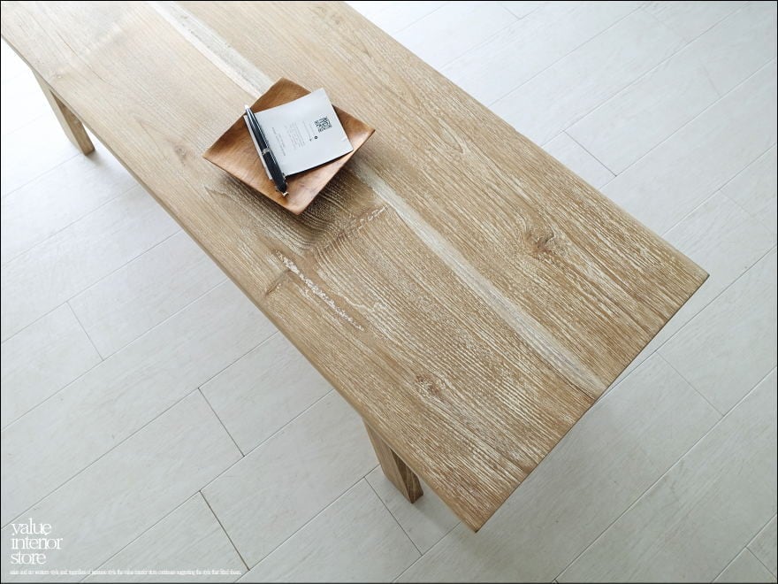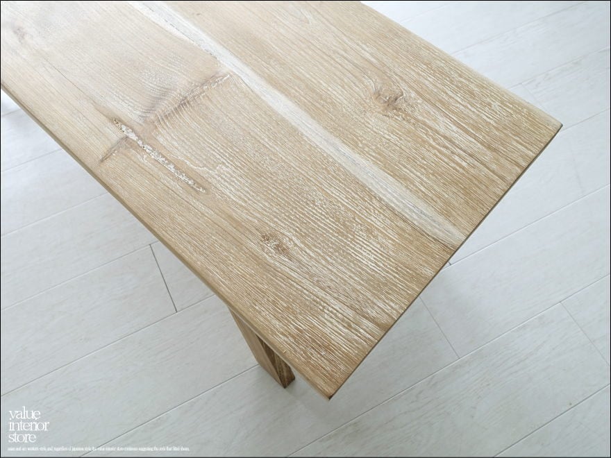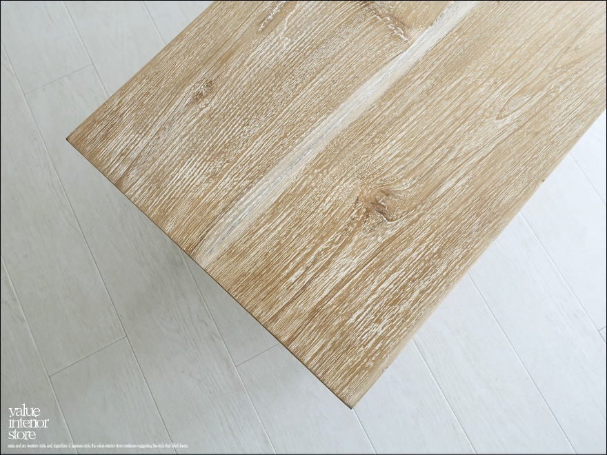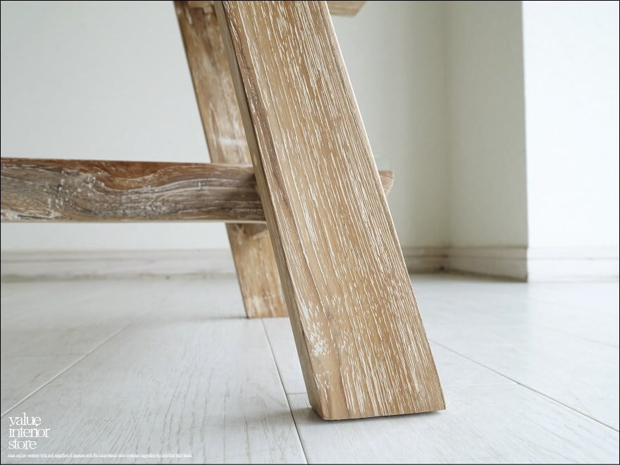表面はワイヤーブラシで軽く削ってから白色を塗布した後に、紙やすりで再度表面を削る手法を用いていますので、木目が際立つシャビーな質感です。チークならではの木肌が全体的に見られ味わい深く仕上がっています。
