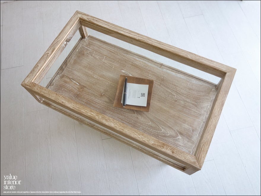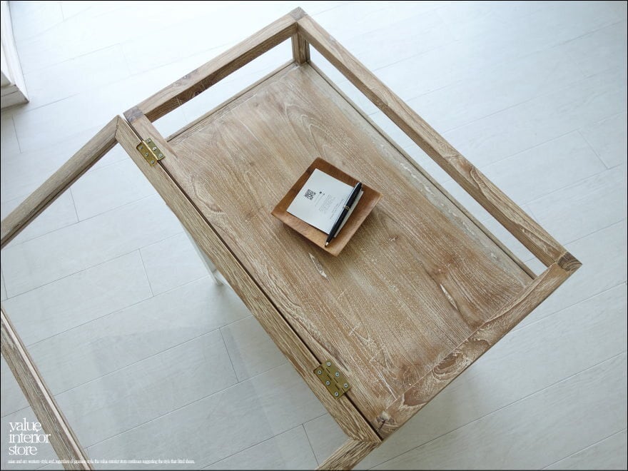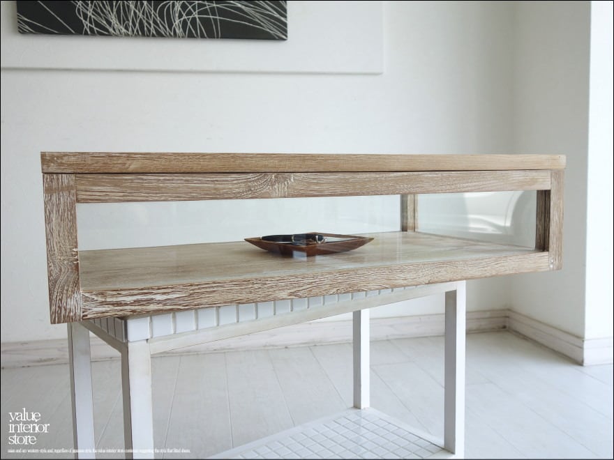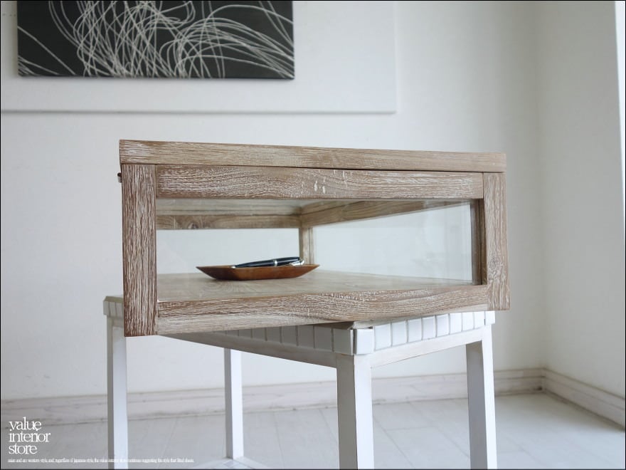 素朴で手づくり感の溢れる、ナチュラルホワイト仕上げのシンプルなチーク無垢材の卓上用のガラスショーケース。5面ガラスで光が入りやすく中がきれいに見えます。