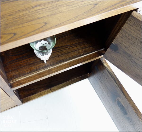スマートな印象ながら、大人っぽく落ち着いたカラーで仕上げることで、チークの持つ張りと硬く美しい木目の特徴を引き出していて、質の良さを十分に感じさせてくれます。また、チークは油分を多く含みますので、お使いいただくうちにさらに色味に深みが増すところも楽しみの一つです。きっとお部屋をスローダウンさせてくれるでしょう。