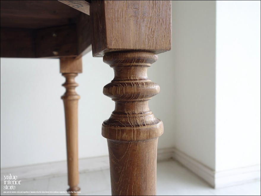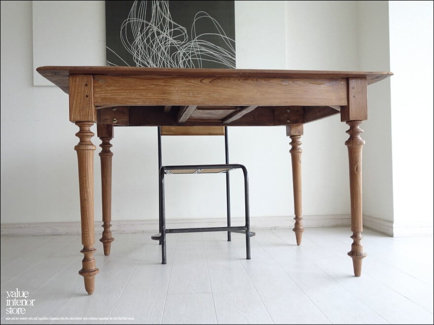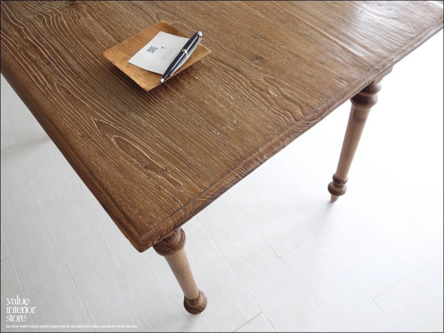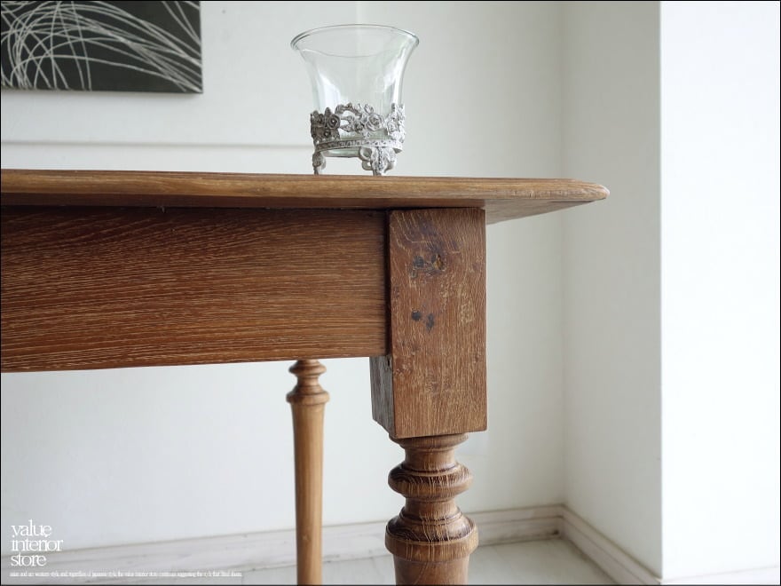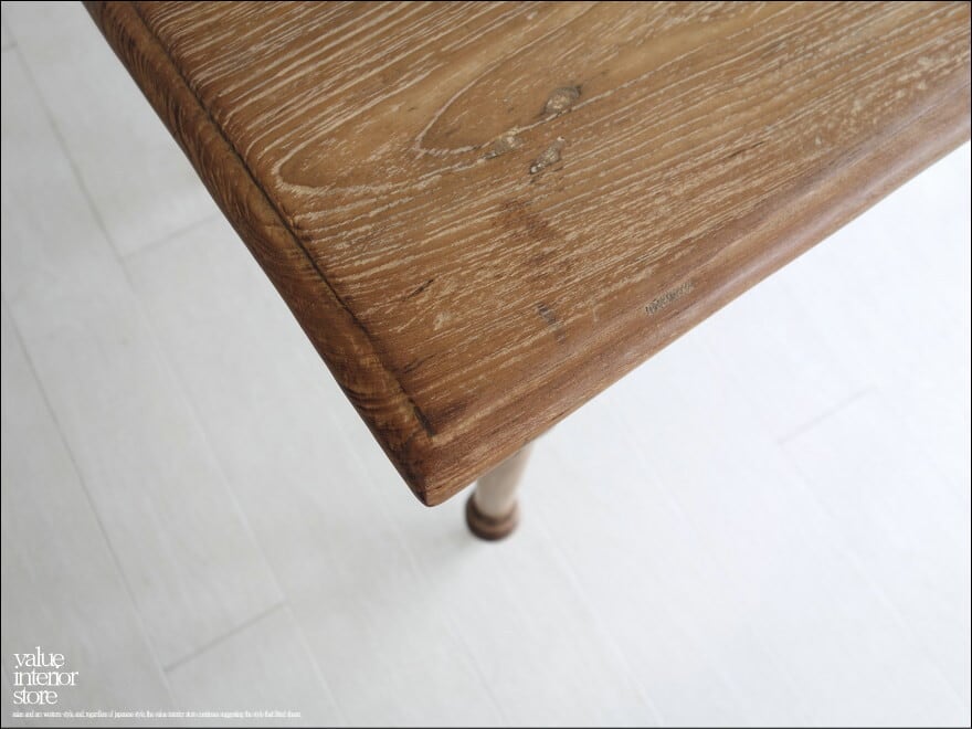 この商品は、欠損箇所の補修後、全体を表面再仕上げをしている再生家具となります。元々の雰囲気は残して仕上げています。傷、ワレやフシ穴、色の濃淡、傾き、歪み、反り、汚れなどがございますが、素材や古いものの持つテイストとしてご理解をいただきますようお願い致します。また、ジョイント部分に使用したビスが表面に露出した個所がありますがフラットに削っています。