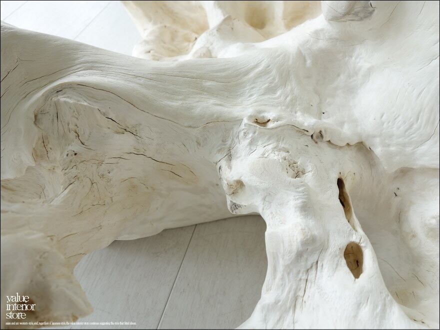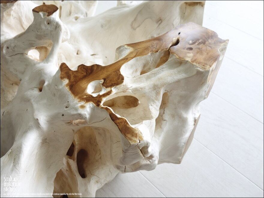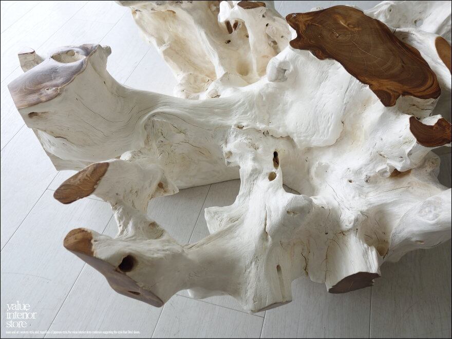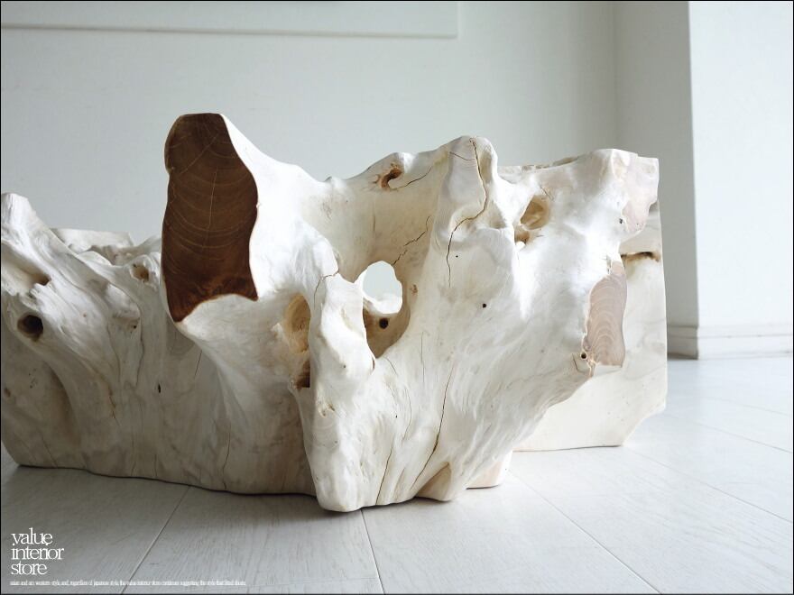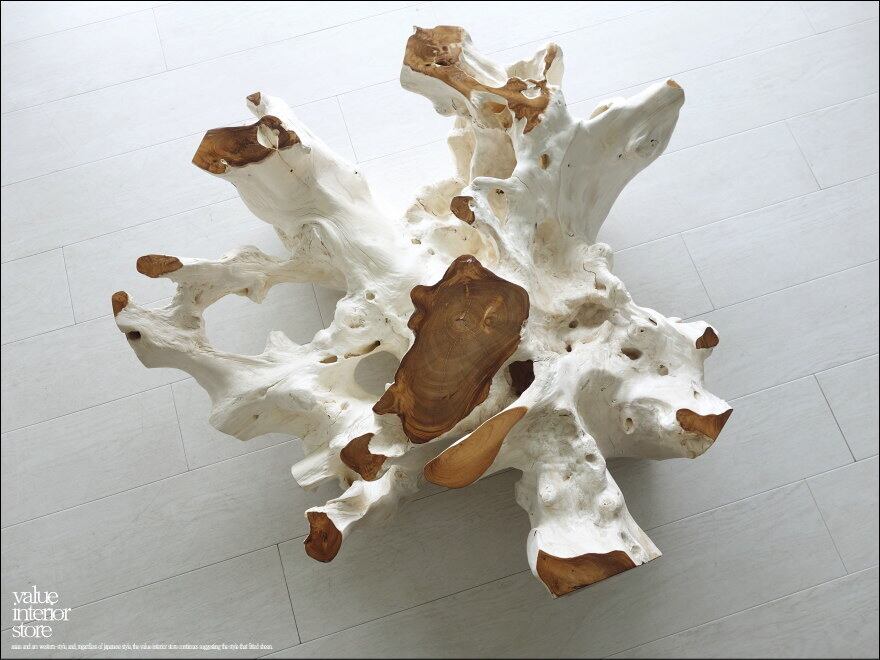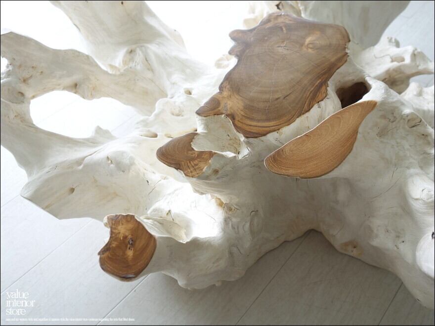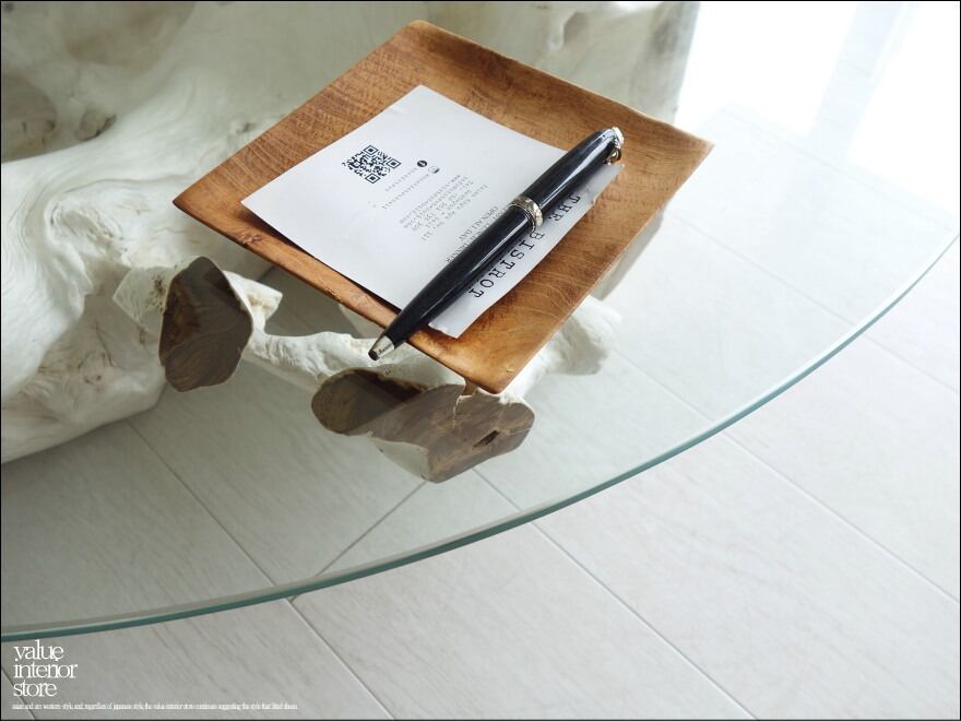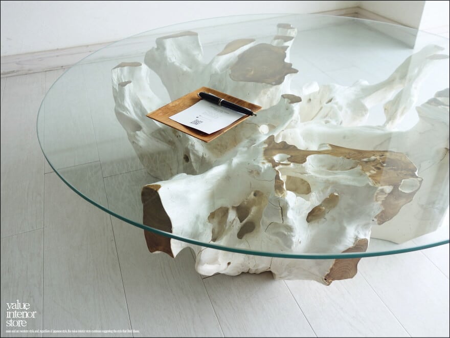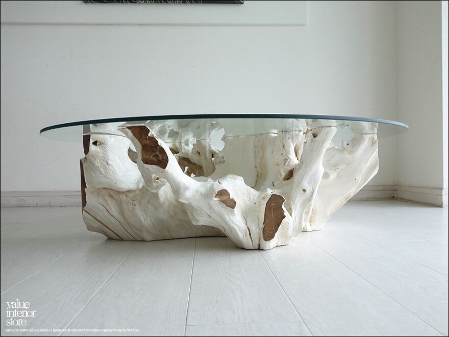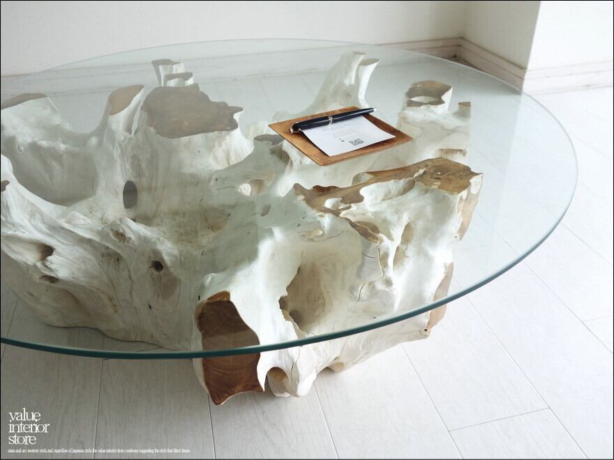 チークの根本をテーブルに使った何ともプリミティブなガラステーブル。