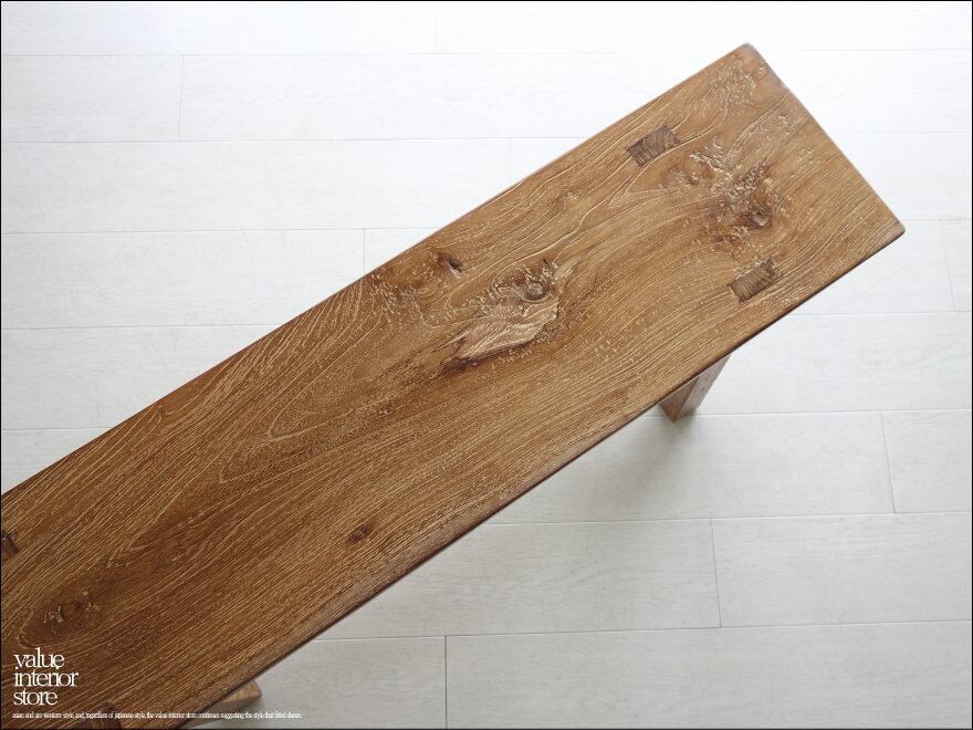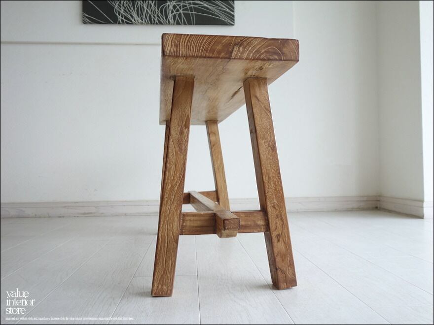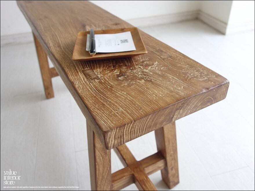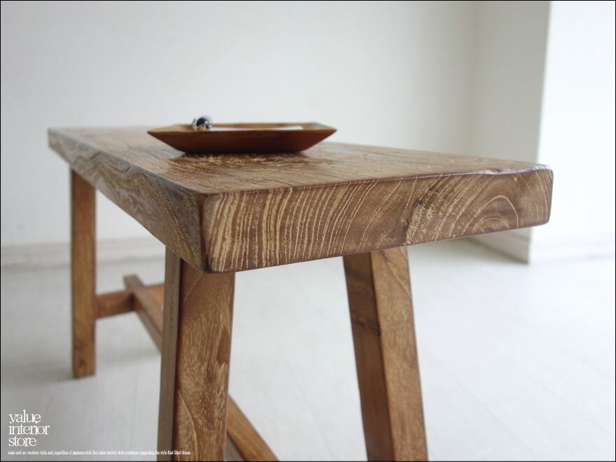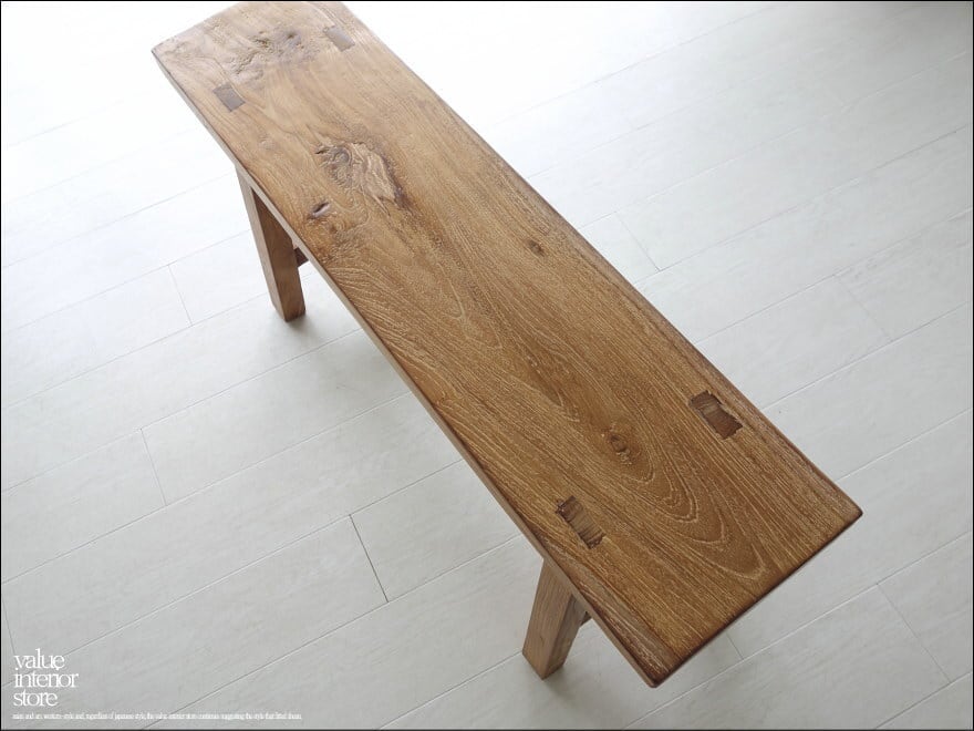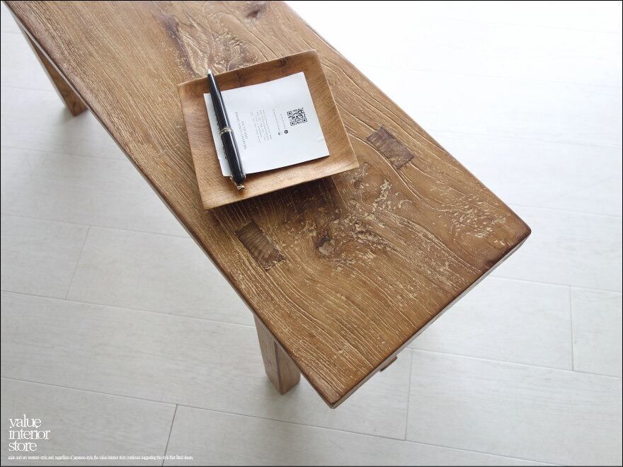 一枚板の座面は厚みもあり長くお使いいただけるしっかりした作りです。チークならではの木目と古材ならではの木肌が全体的に見られ味わい深く仕上がっています。職人さんが丹精こめて作った印象に溢れていて、きっとお部屋をスローダウンした素敵な雰囲気に包んでくれます。ベンチだけでなくインテリアのディスプレイ台としてもステキです。