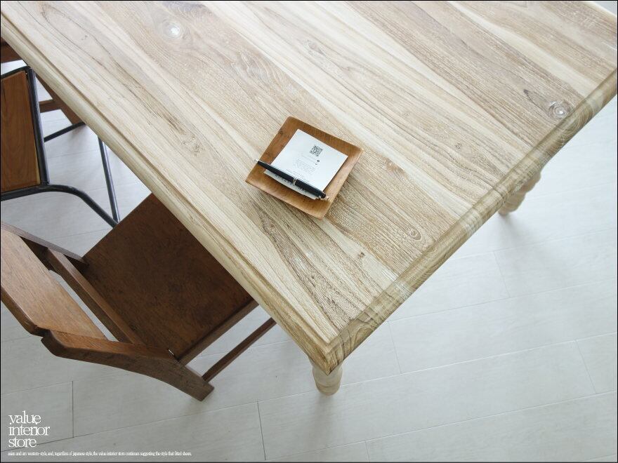 天板を支える脚、また、幕板もこだわったデザインで大人の雰囲気があります。チークの渋く硬い特徴やフシなどの木が本来持つ個性的なキャラクターが大変面白く、また、手作りでしか出せない素朴な質感とのバランスも良いです。良質な油分を豊富に含むチーク材ですので、徐々にチーク色に変化していくところも楽しんでいただけるダイニングテーブル。こんなテーブルで毎日食事ができたらステキですね。ショップやカフェのテーブルとしてもおすすめです。