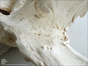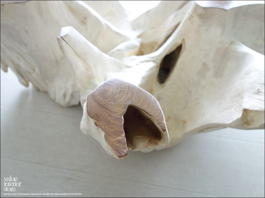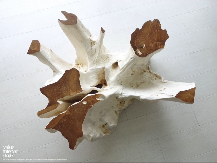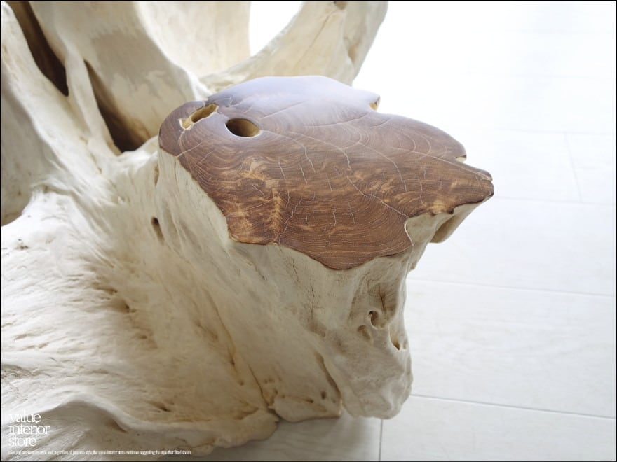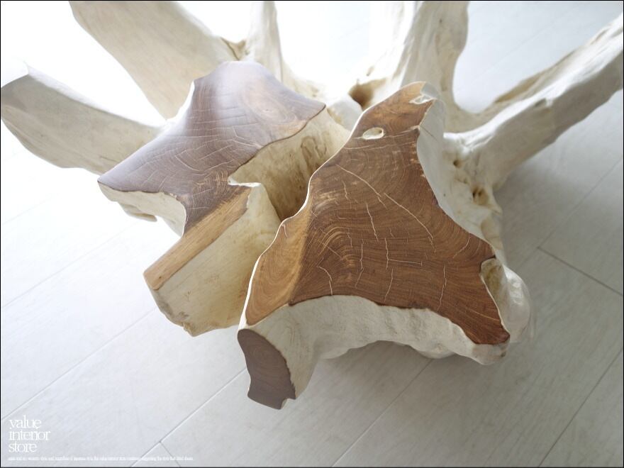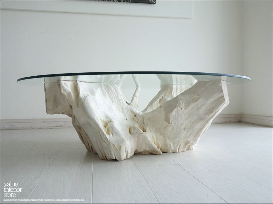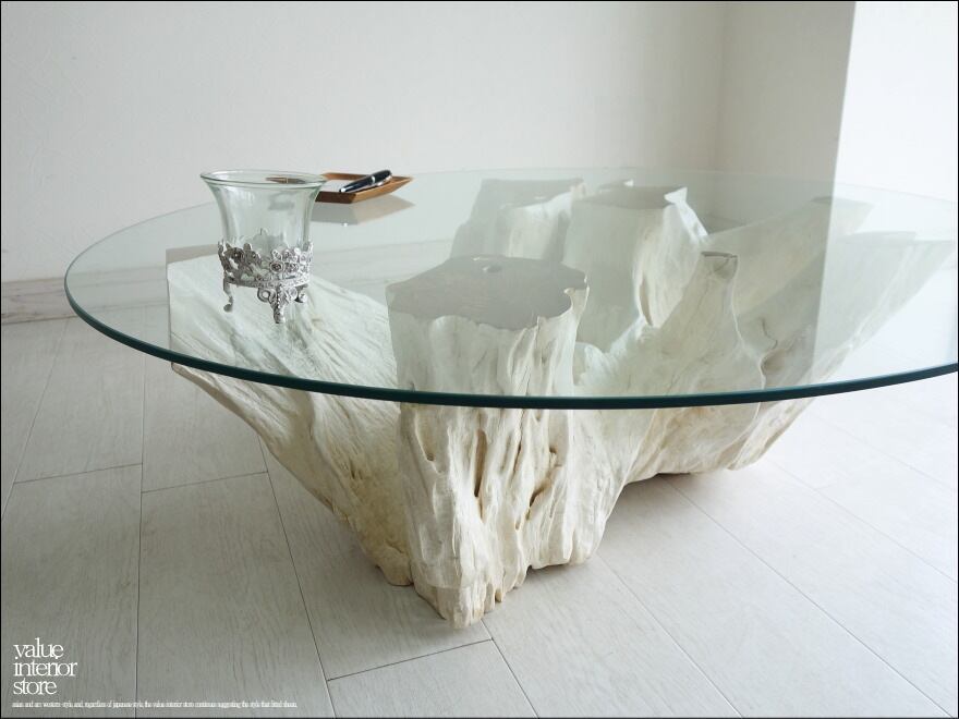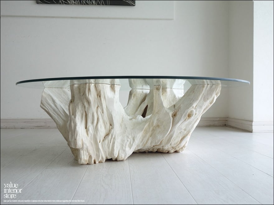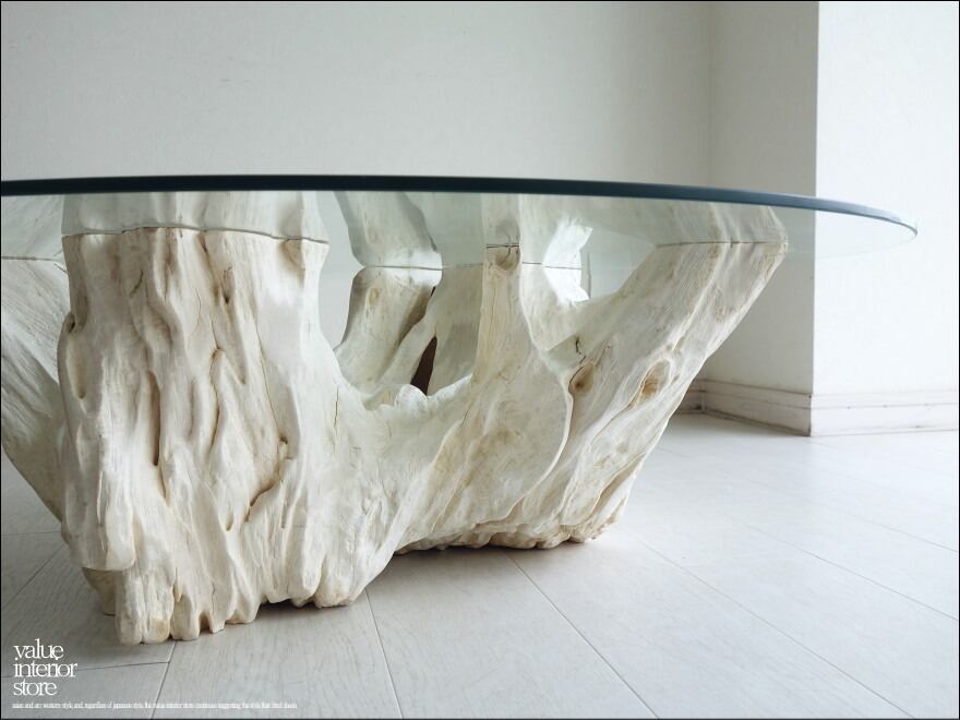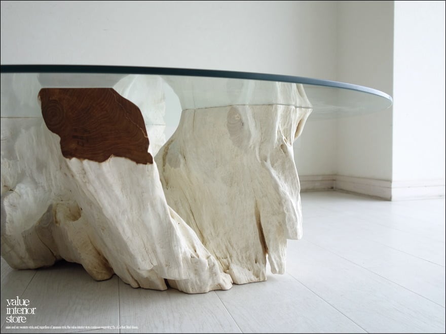 チークの根本をテーブルに使った何ともプリミティブなガラステーブル。