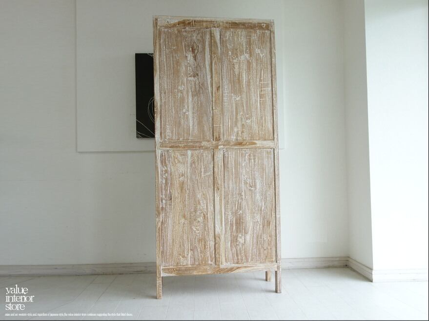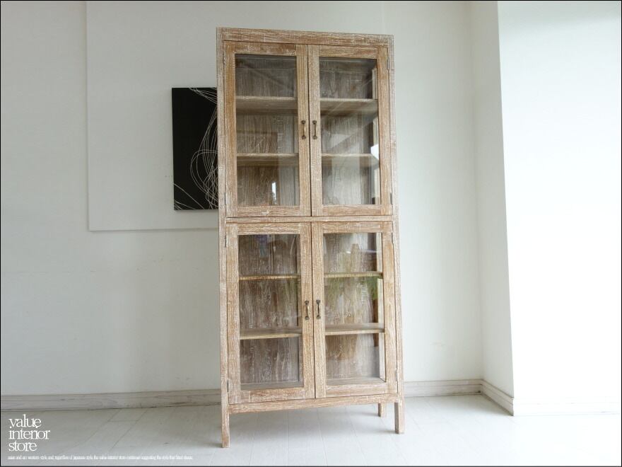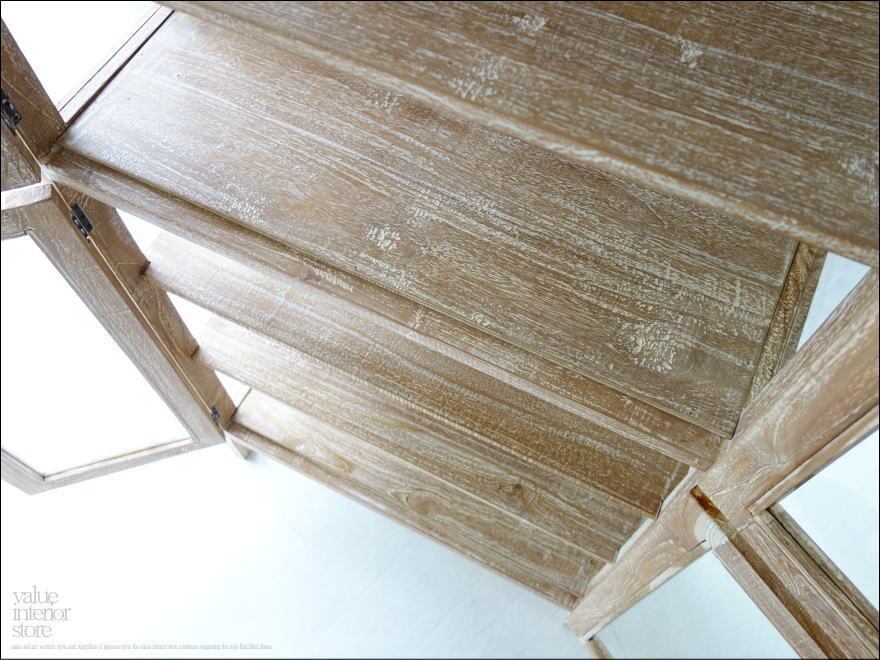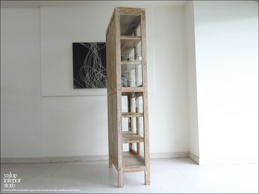 表面をワイヤブラシで軽く削ってから白色を塗布して乾燥をさせた後に、サイディングをして仕上げます。硬く張りのあるチーク材だけらこそできる表面仕上です。シャビーな雰囲気のあるガラスケース。