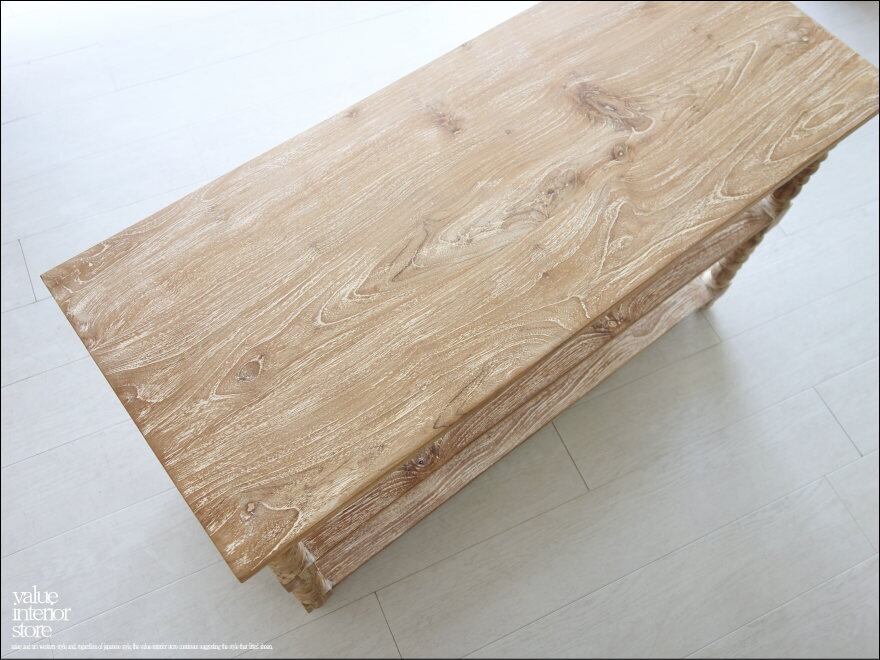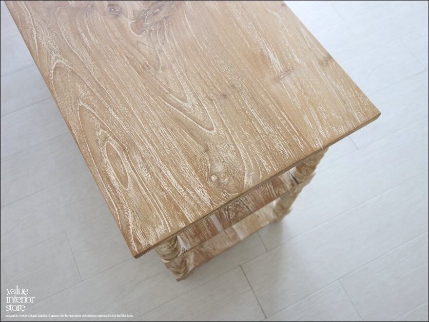表面は凹みに白色を薄く残したナチュラルホワイト仕上げ。表面仕上げに一工夫することで、一層素朴で明るい雰囲気に仕上がりました。余分な装飾を無くしたシンプルな棚板と、丸く柔らかな印象の脚とのバランスがとってもかわいいですよ。きっとお部屋を素敵な雰囲気に包んでくれます。