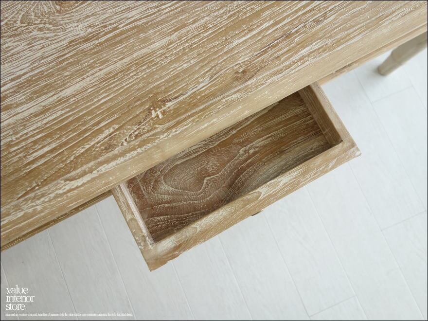 表面は凹みに白色を薄く残したナチュラルホワイト仕上げ。表面仕上げに一工夫することで、一層素朴で明るい雰囲気に仕上がりました。装飾を施したフレームを柔らかな丸脚が支えていて、そのバランスも素敵です。