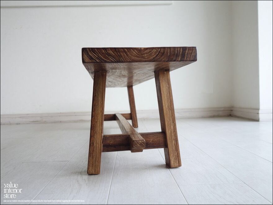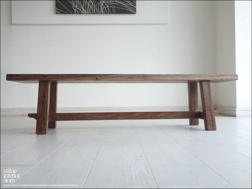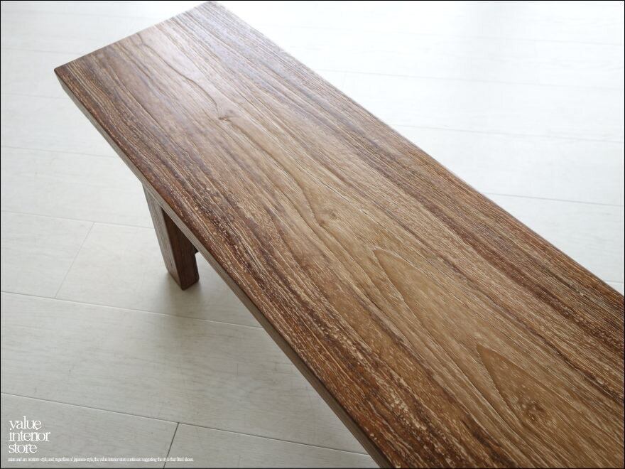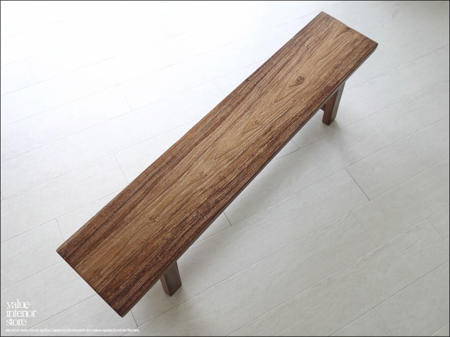 一枚板の座面は厚みもあり長くお使いいただけるしっかりした作りです。チークならではの木目と古材ならではの木肌が全体的に見られ味わい深く仕上がっています。職人さんが丹精こめて作った印象に溢れていて、きっとお部屋をスローダウンした素敵な雰囲気に包んでくれます。ベンチだけでなくインテリアのディスプレイ台としてもステキです。