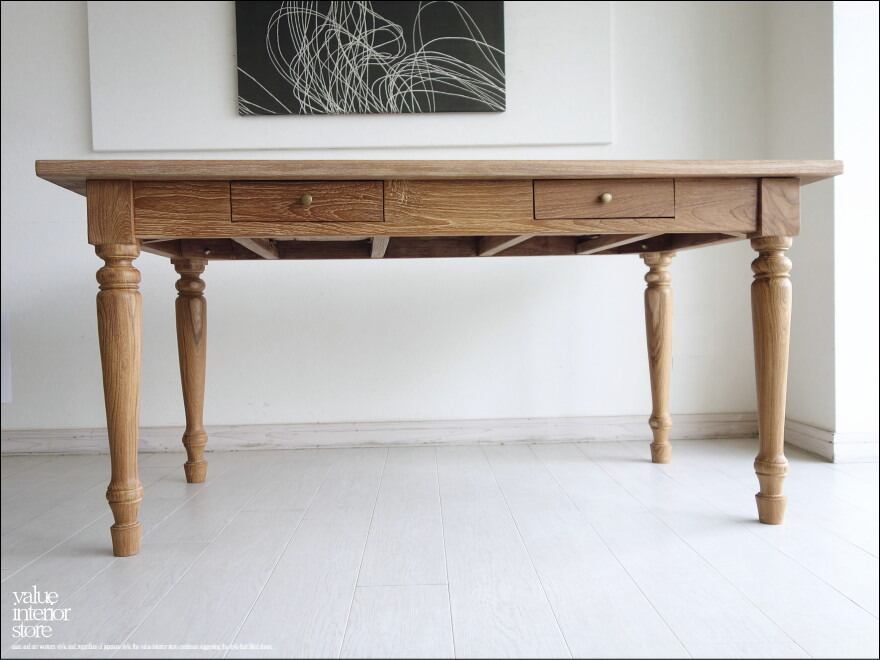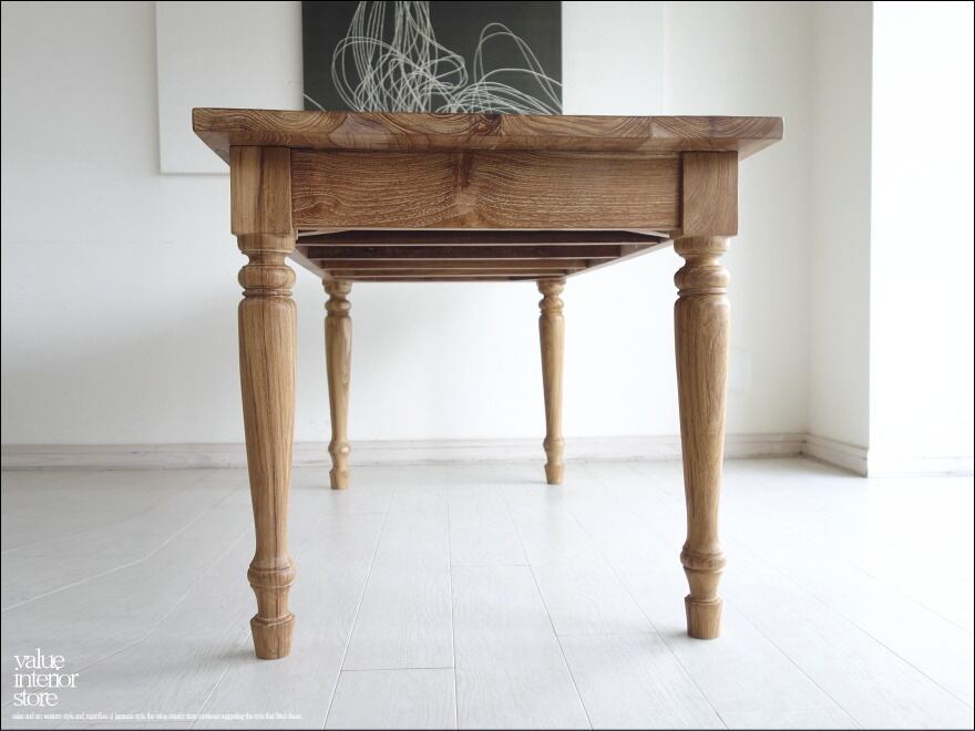 ナチュラルカラーながら表面仕上げに一工夫することで、素朴で落ち着いた雰囲気に仕上がりました。チークの渋く硬い特徴を引き出す角型の天板を柔らかな丸脚が支えていて、そのバランスが素敵です。シンプルなデザインで、チークの良さを存分に楽しんでいただけるステキなダイニングテーブルです。