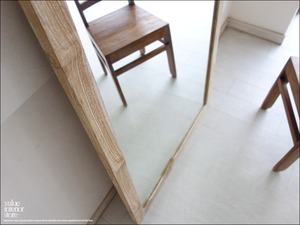 チークの表面をワイヤーブラシで軽く削り、木目を起こした後で薄っすらと白色を塗布してからペーパーで表面を磨くナチュラルホワイト仕上げのミラー。全身を映せるサイズの姿見です。シンプルでどんなテイストにも馴染みやすいデザインですので、空間を暖か味のある雰囲気に演出します。フレーム裏面縦方向に2箇所壁掛け用の穴がありますので壁にビスを設置して頂き引っ掛けるか、安全な場所に立掛けてご使用下さい。