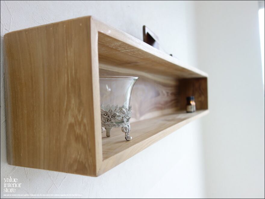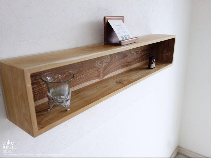 木目が美しいシンプルなデザインのチークウォールシェルフ。
