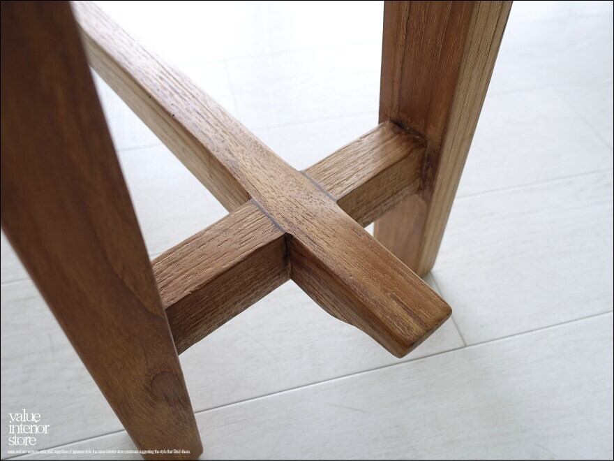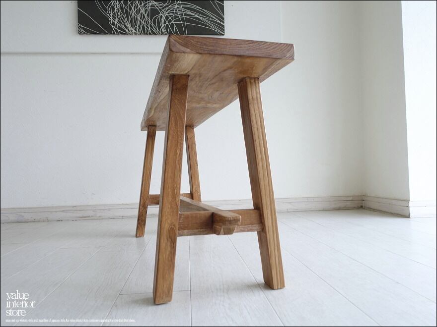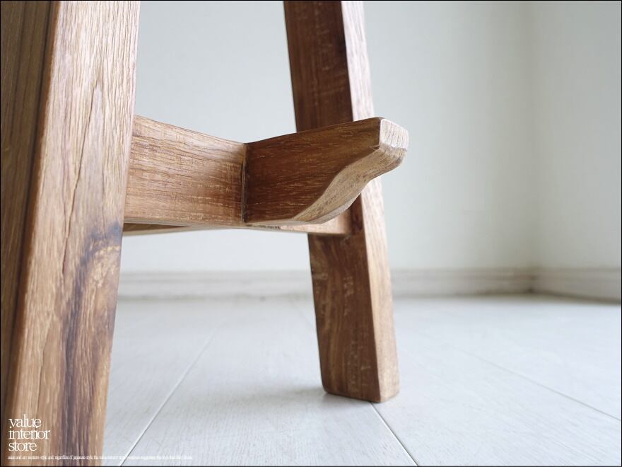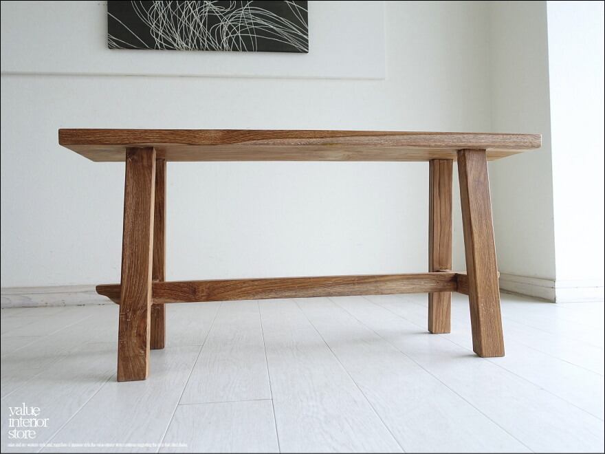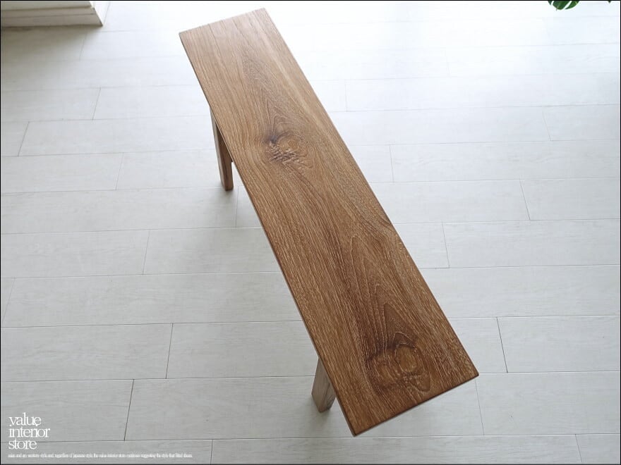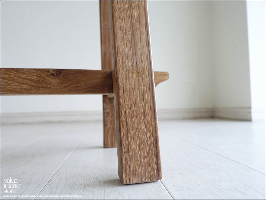 一枚板の座面は厚みもあり長くお使いいただけるしっかりした作りです。チークならではの木目と古材ならではの木肌が全体的に見られ味わい深く仕上がっています。職人さんが丹精こめて作った印象に溢れていて、きっとお部屋をスローダウンした素敵な雰囲気に包んでくれます。ベンチだけでなくインテリアのディスプレイ台としてもステキです。