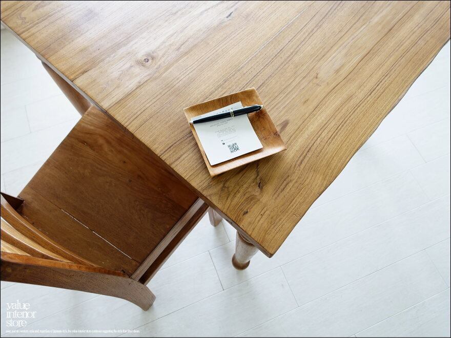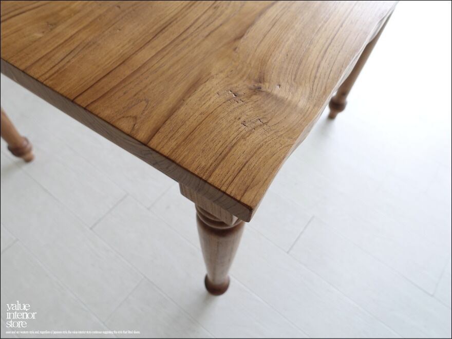 一目見ただけで木目の味わい深さを感じられるオールドチークのダイニングテーブル。