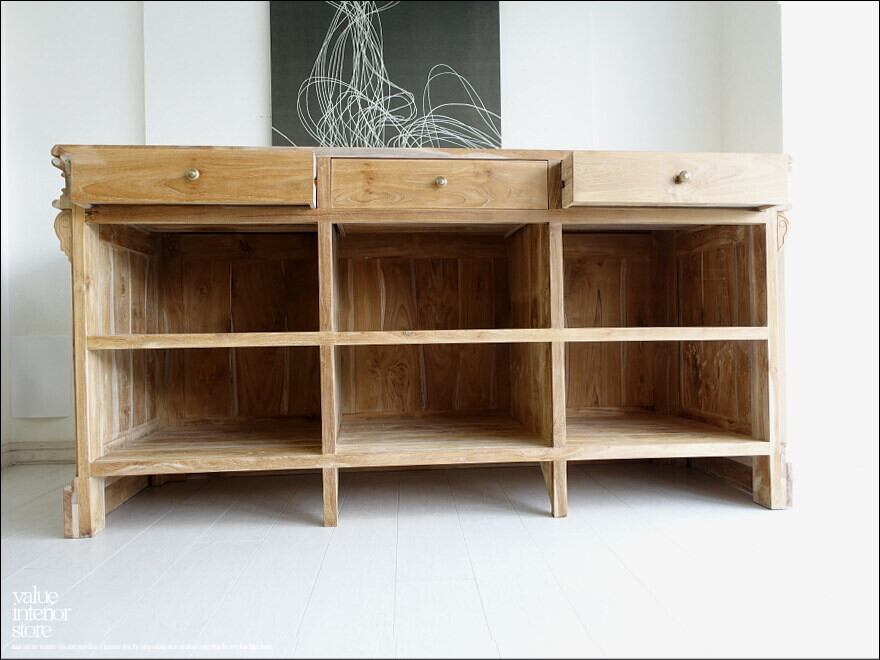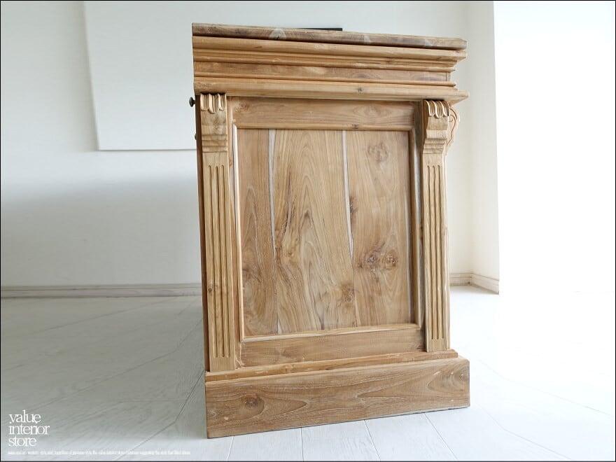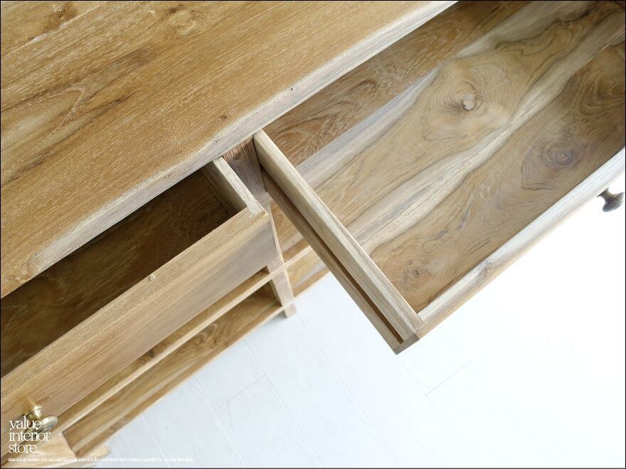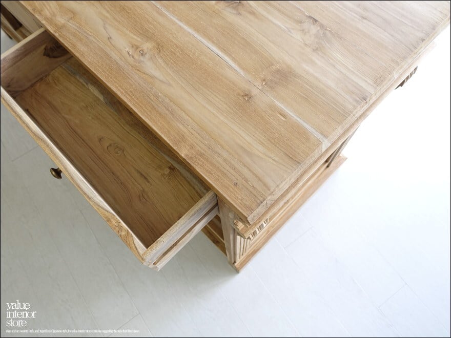 表面はチーク材の美しい木目と質感を感じていただけます。カウンターテーブル、飾り台としてお使いください。引出しの取っ手には、大きめの無垢の真鍮ハンドルを使用しました。表面は凹みにわずかに入った白色がシャビーで素朴な印象を感じられます。雑貨店や美容室のレジ台にもどうぞ。
