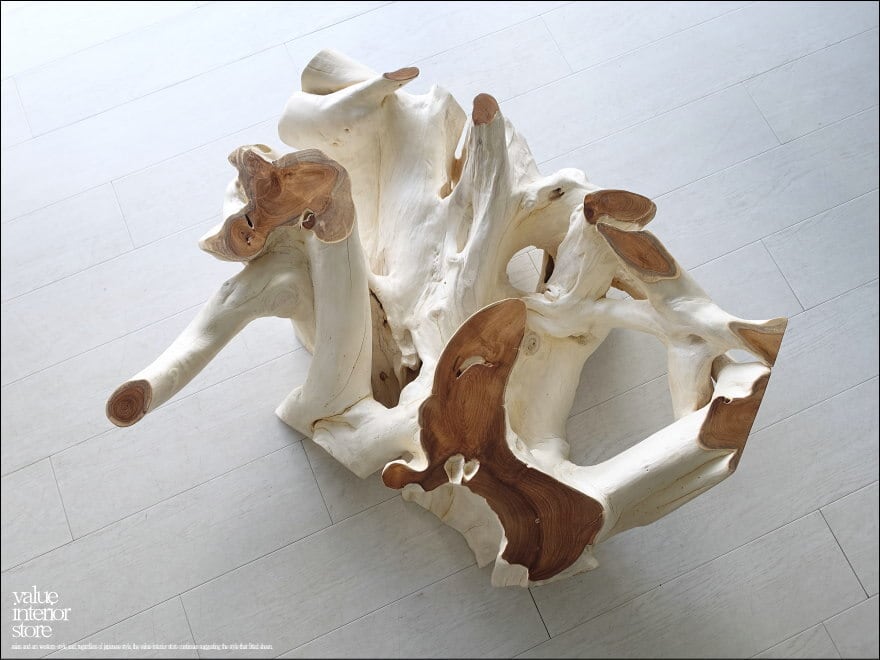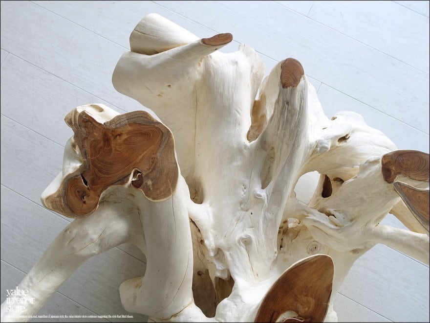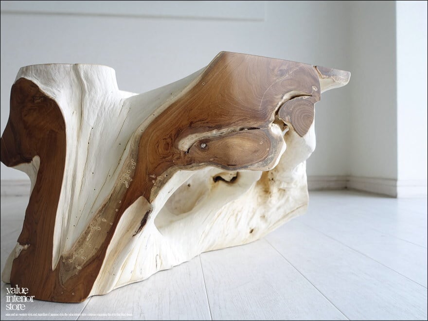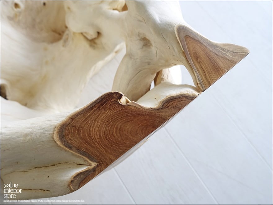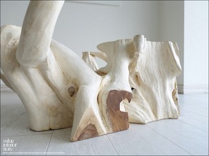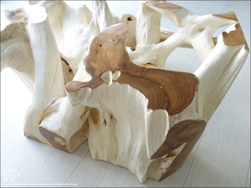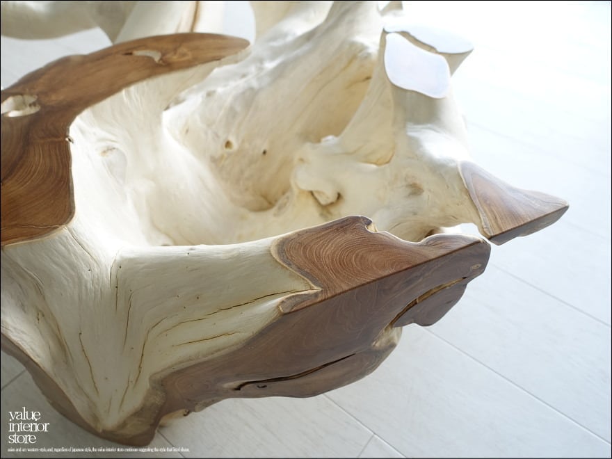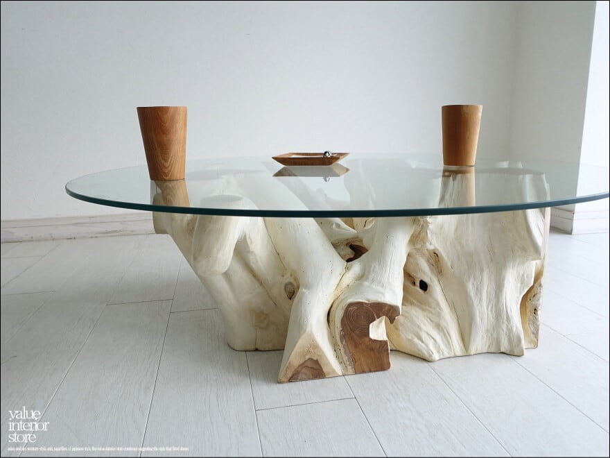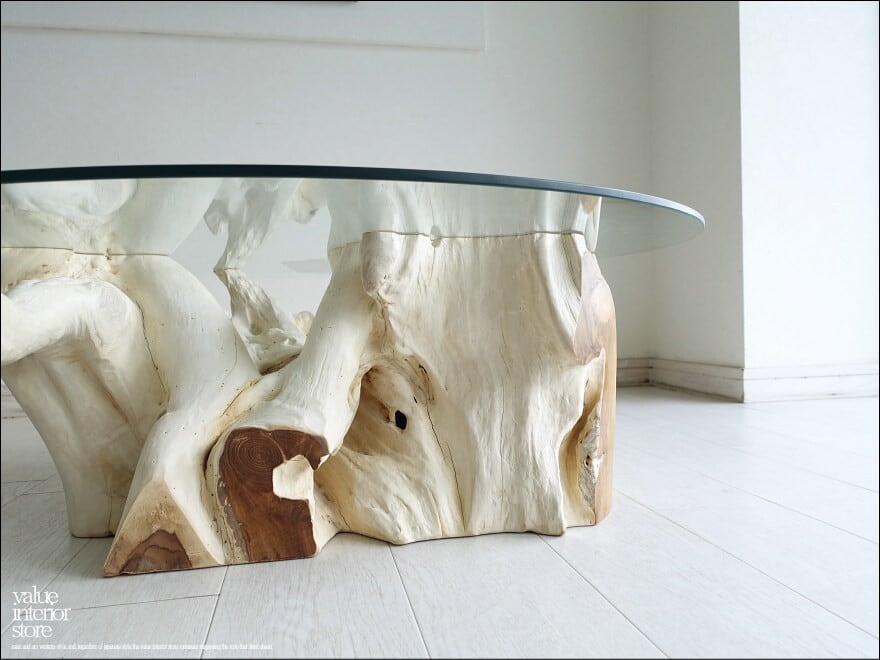 チークの根本をテーブルに使った何ともプリミティブなガラステーブル。