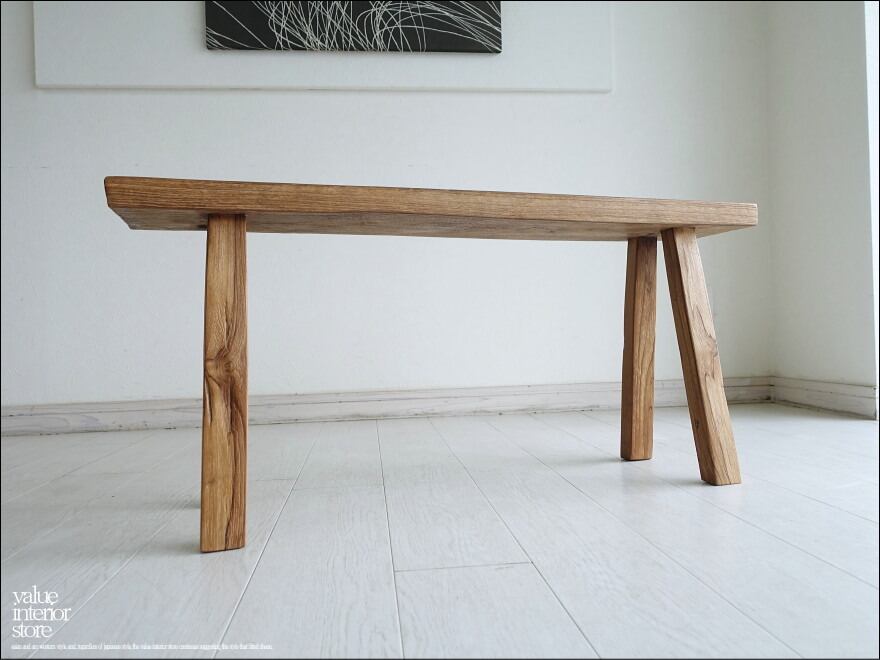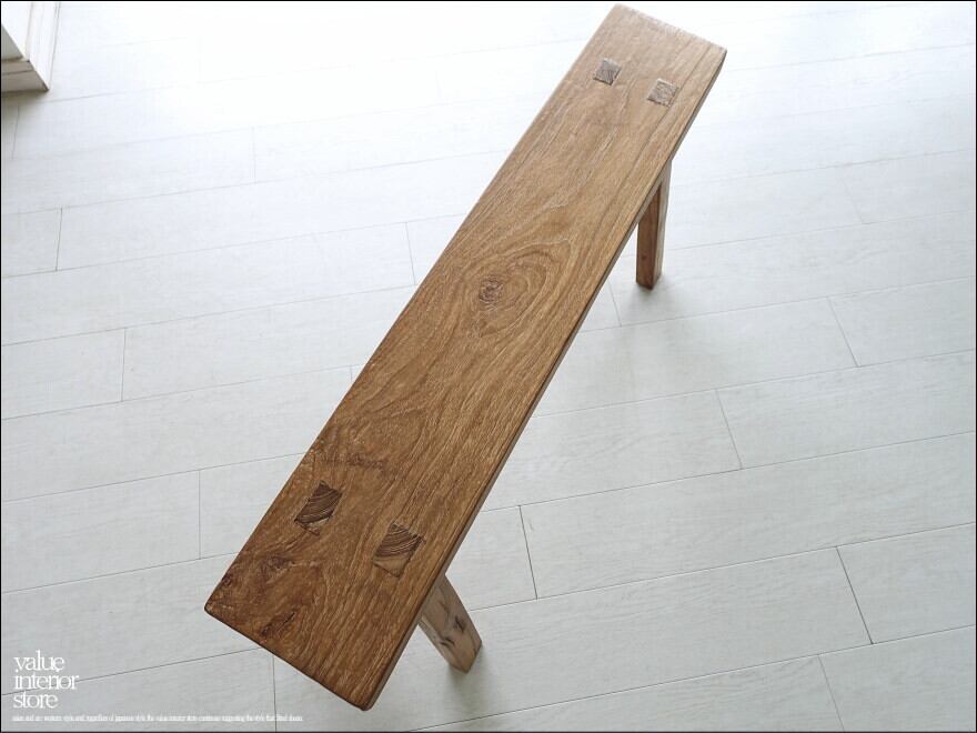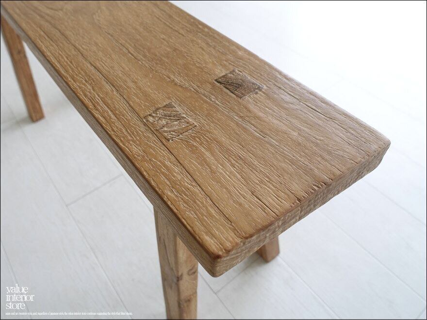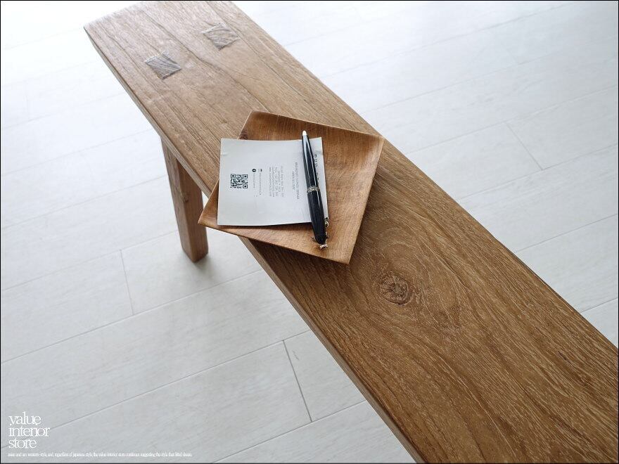 一枚板の座面は厚みもあり長くお使いいただけるしっかりした作りです。チークならではの木目と古材ならではの木肌が全体的に見られ味わい深く仕上がっています。職人さんが丹精こめて作った印象に溢れていて、きっとお部屋をスローダウンした素敵な雰囲気に包んでくれます。ベンチだけでなくインテリアのディスプレイ台としてもステキです。