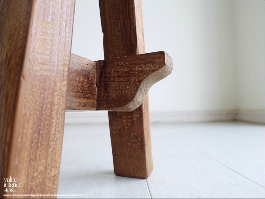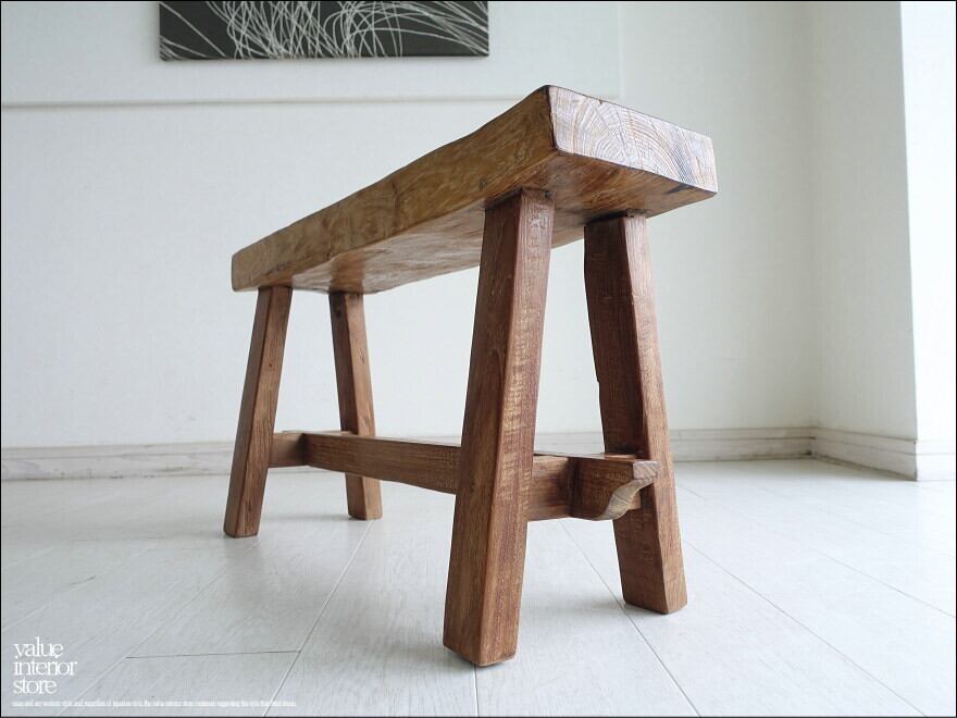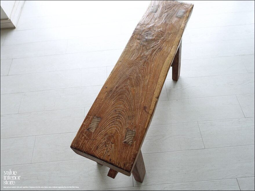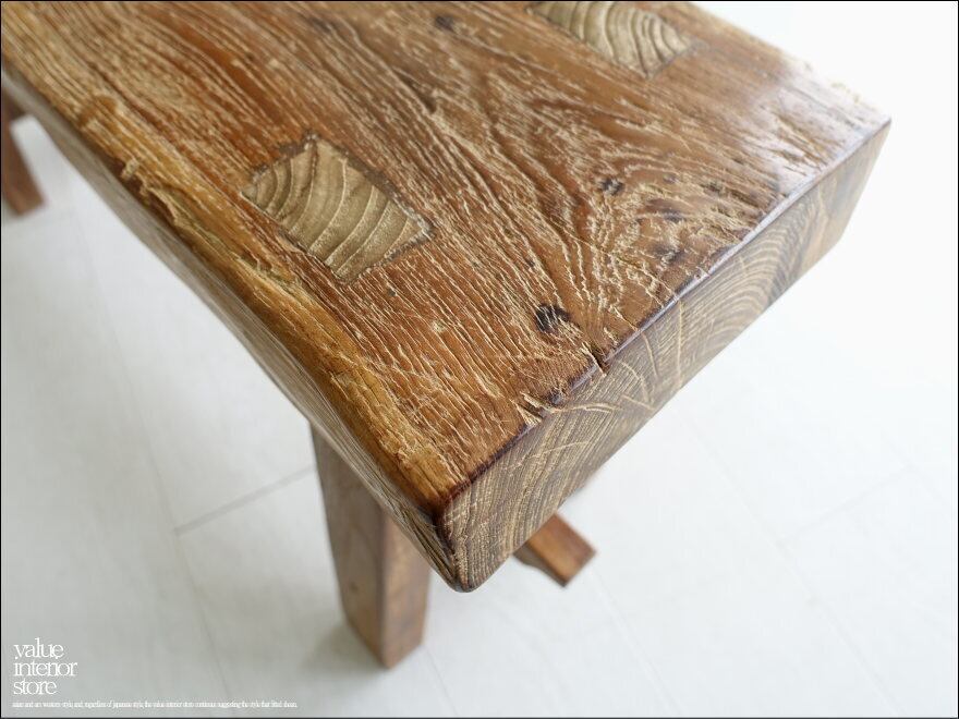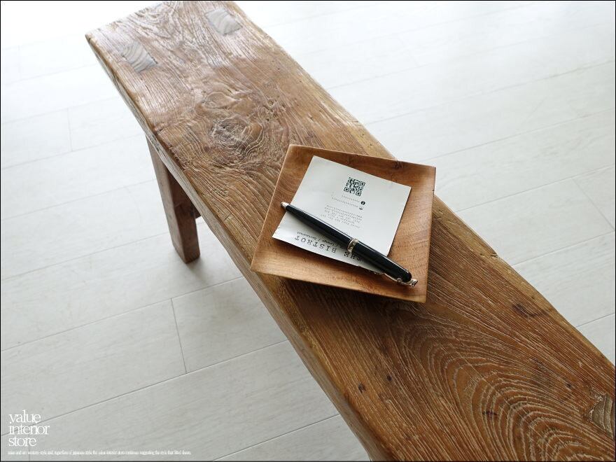 一枚板の座面は厚みもあり長くお使いいただけるしっかりした作りです。チークならではの木目と古材ならではの木肌が全体的に見られ味わい深く仕上がっています。職人さんが丹精こめて作った印象に溢れていて、きっとお部屋をスローダウンした素敵な雰囲気に包んでくれます。ベンチだけでなくインテリアのディスプレイ台としてもステキです。